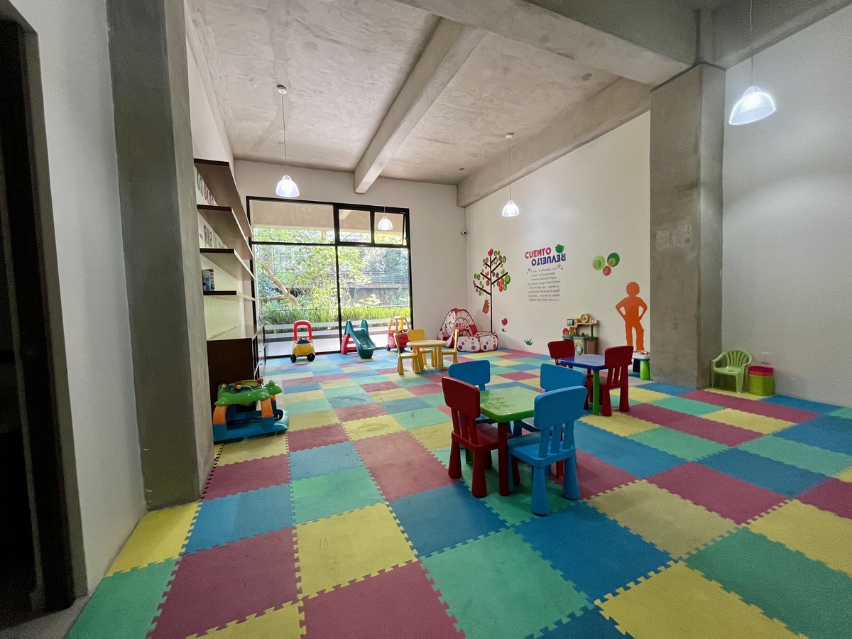 Salón de usos múltiples, gym, ludoteca, salón de juegos con mesa de billar, áreas verdes y juegos para niños.