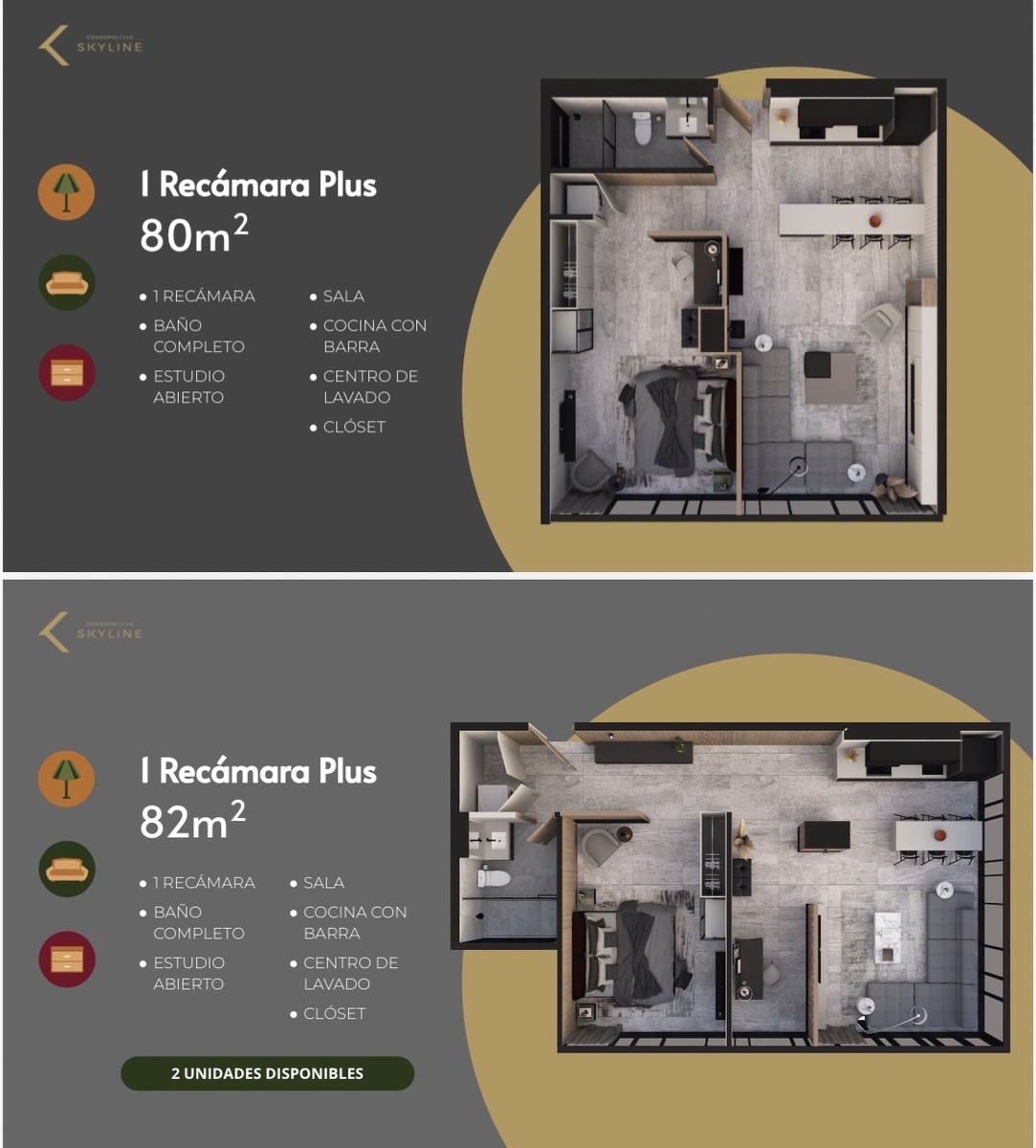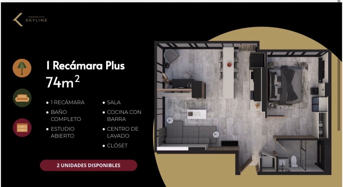 1 recámara, 1 baño completo, estudio abierto, sala, cocina con barra, centro de lavado, clóset, 1 cajón de estacionamiento