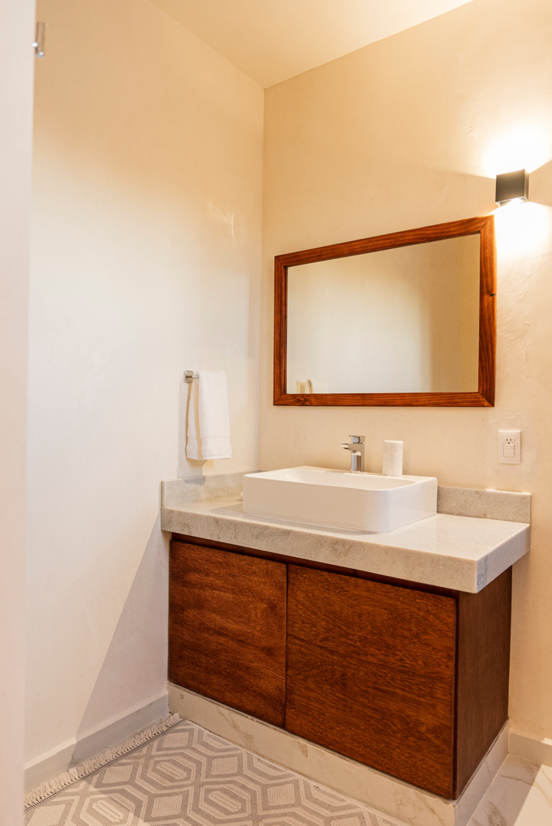 Recámara secundaria con clóset en pared y baño completo (cama matrimonial)