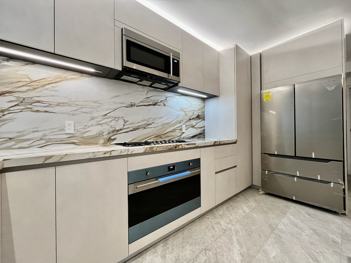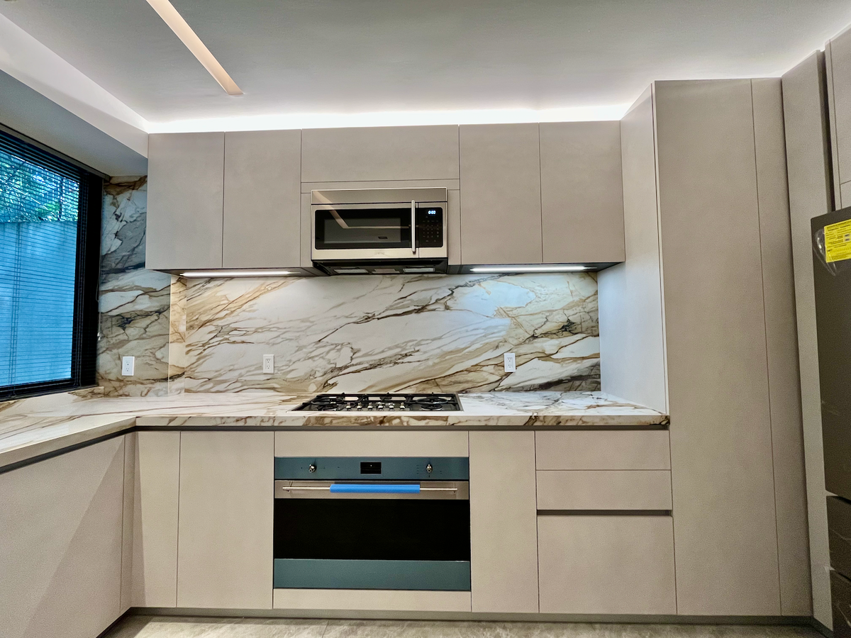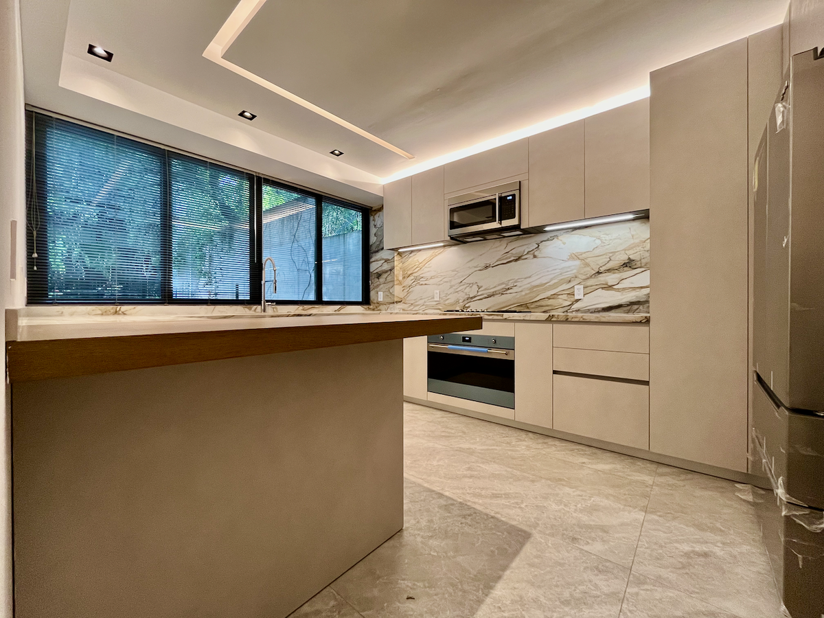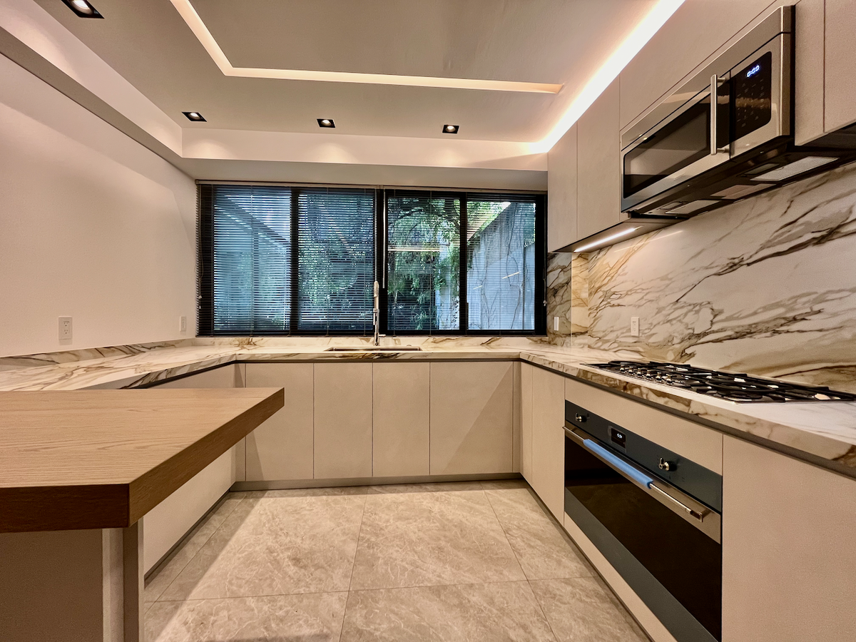 La cocina cerrada, completamente revestida en mármol. Además, el baño de visitas, también con acabados en mármol, agrega un toque de sofisticación adicional.