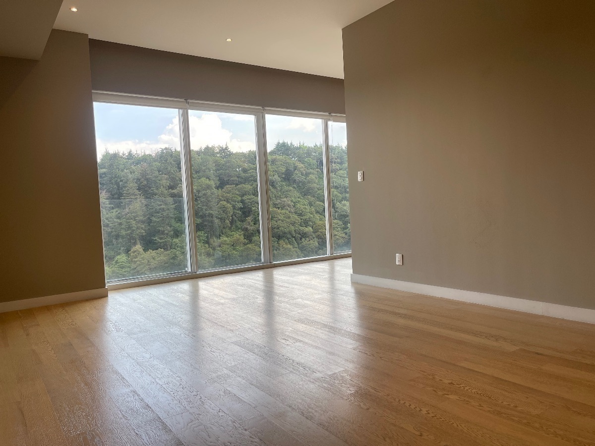 Departamento de lujo en zona exclusiva. En medio de bosques e impresionantes vistas. Gimnasio, alberca techada, canchas de pádel, salón de eventos, salón de usos múltiples, salón de jóvenes, ludoteca, áreas verdes, casa club en Cumbres Santa Fé.
