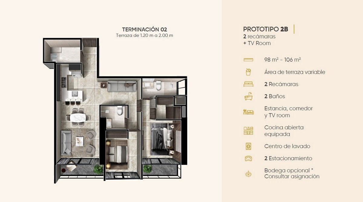 2 recámaras (algunos + TV Room)