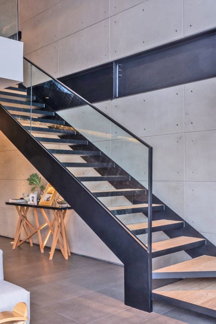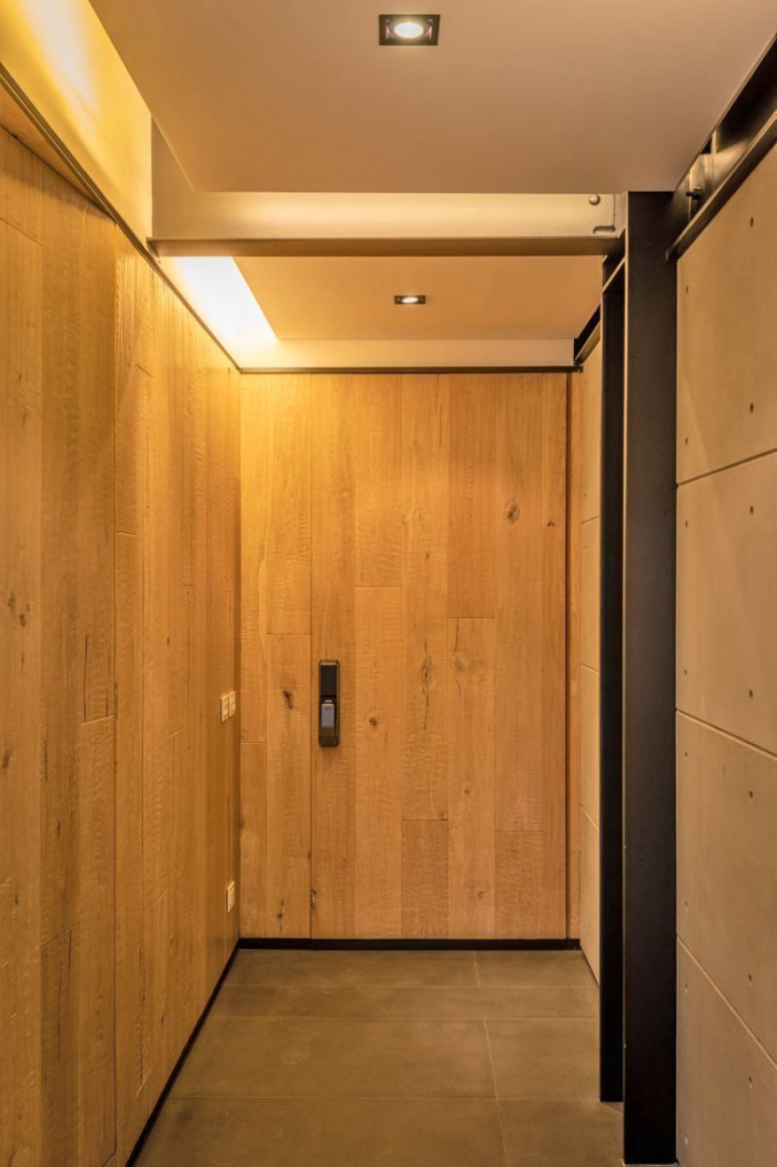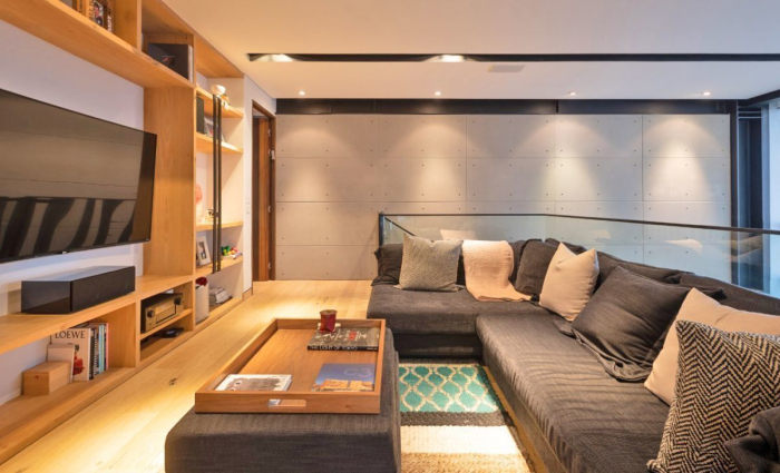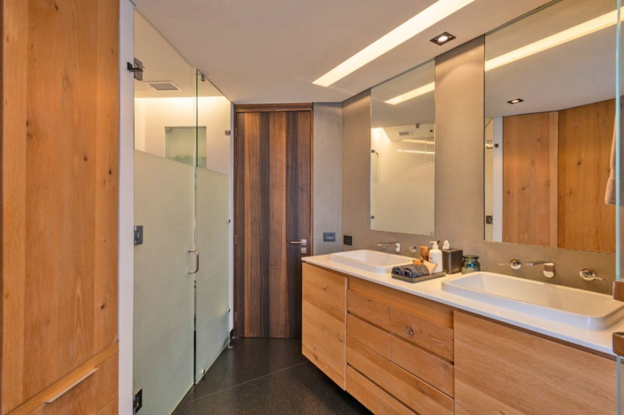 Marble floors in the living room, combined with Eucalyptus and Oak woods on the walls and engineered wood on the upper floor. Lighting design and wiring for sound.