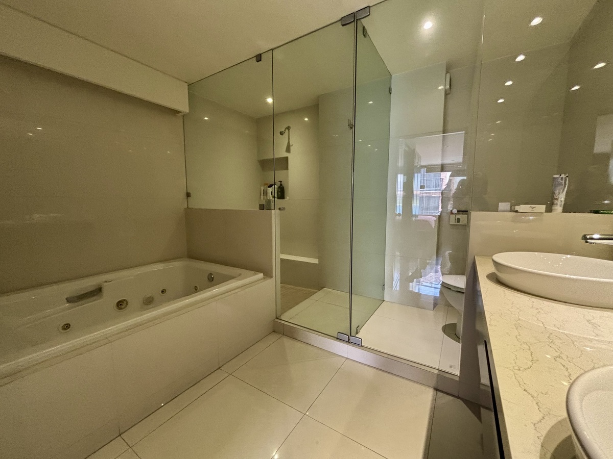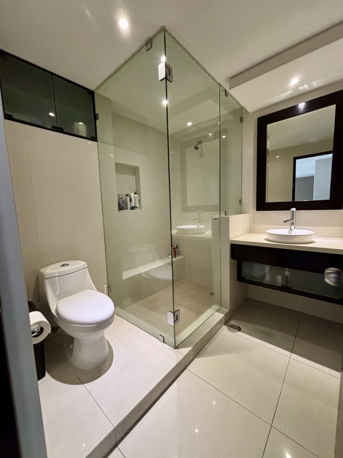 Baños con cubiertas de mármol y regadera con puertas de cristal templado.
