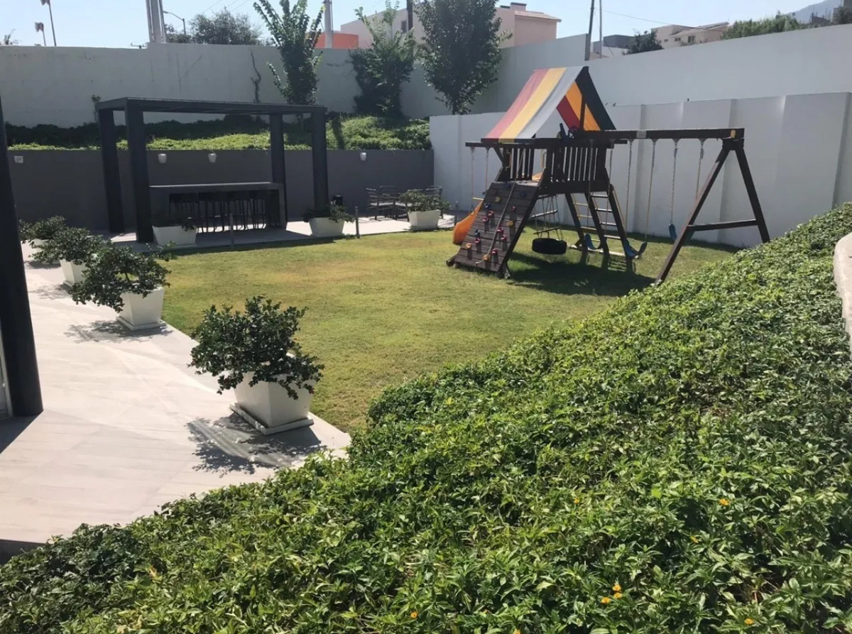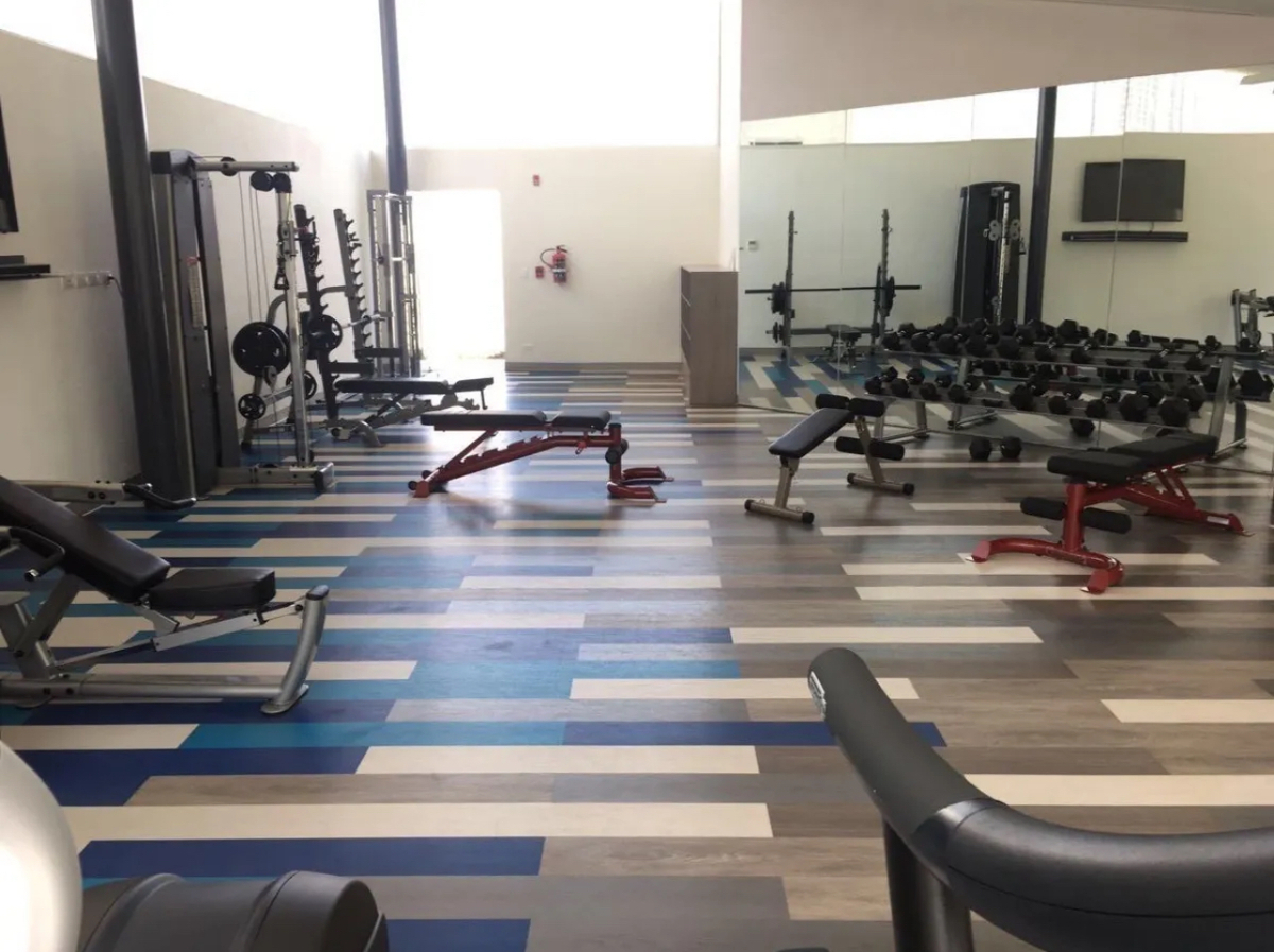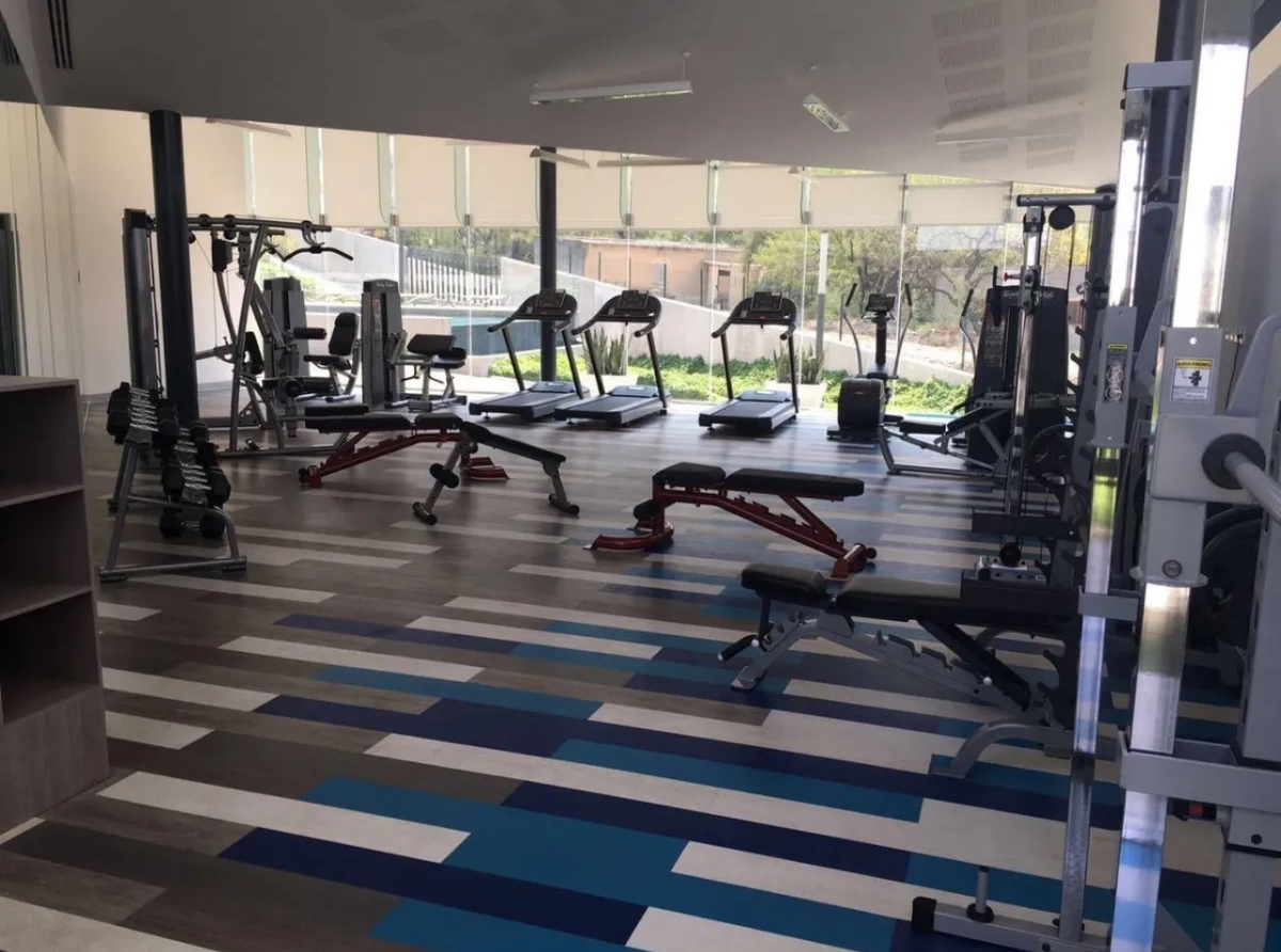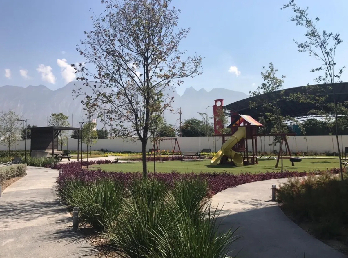 Parque con vereda para caminar, alberca, gym y salón de juegos