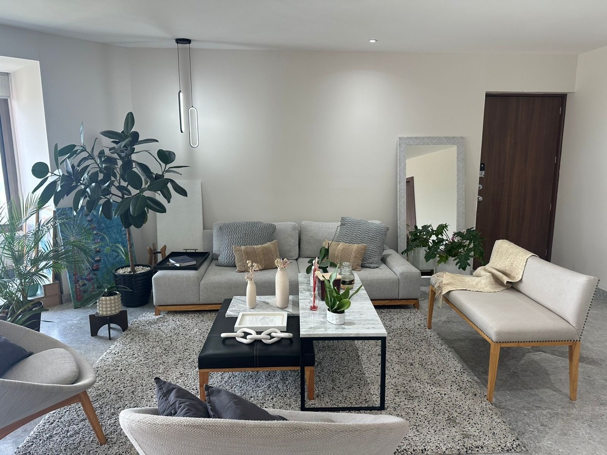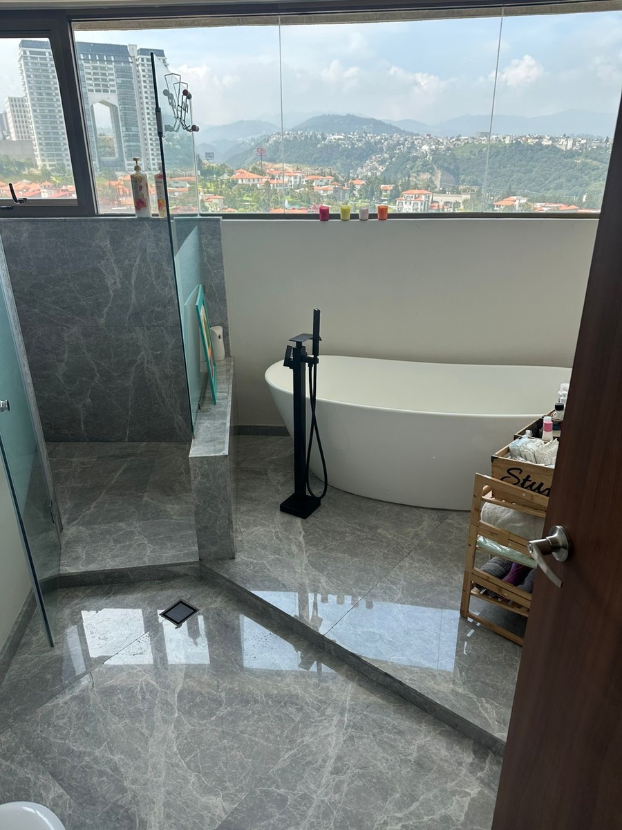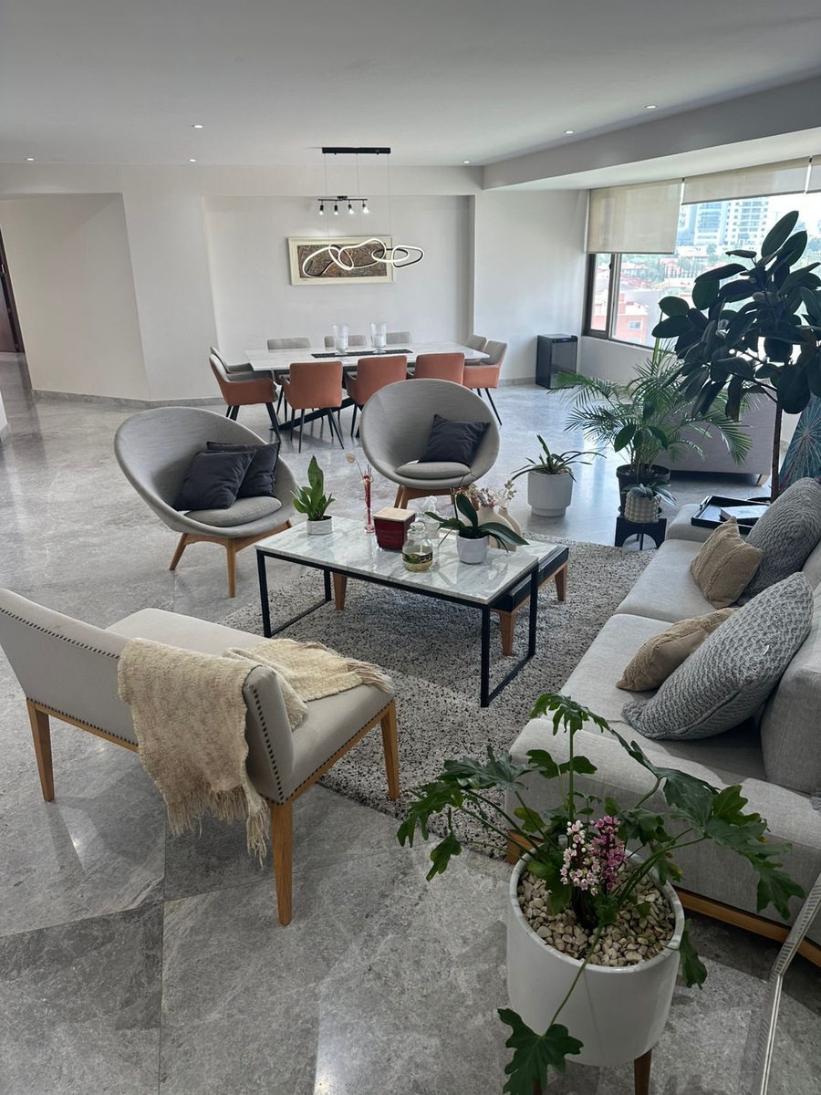Cuenta con tres recámaras en suite, cada una con su propio baño y generosos closets de carpintería fina, además de un baño de visitas. La sala y comedor se integran en un ambiente cálido y sofisticado, con pisos nuevos y ventanales de piso a techo que inundan el espacio de luz natural y regalan vistas espectaculares.