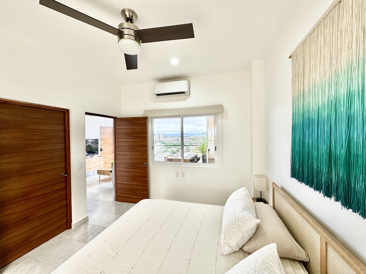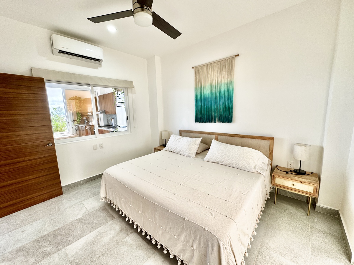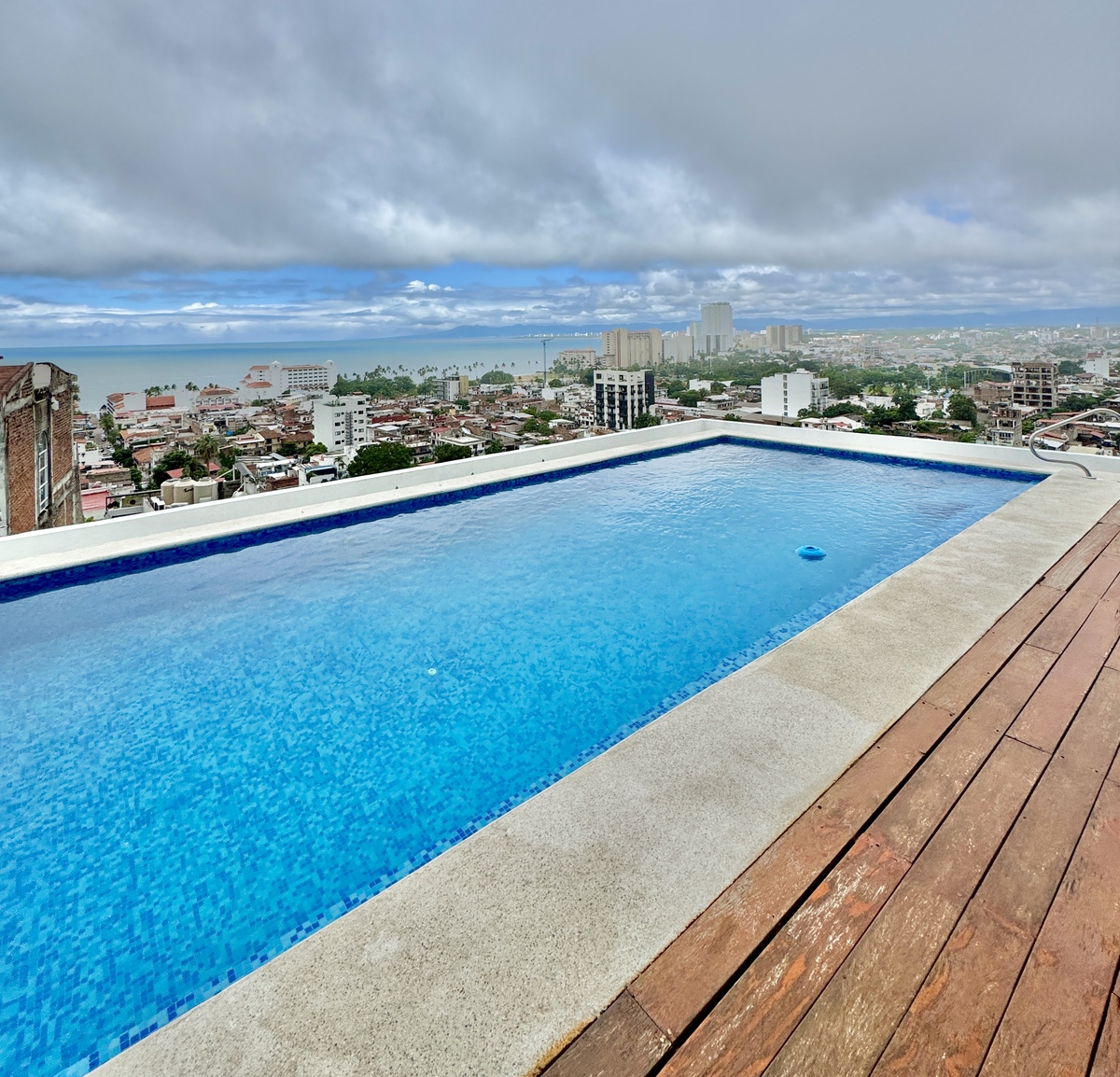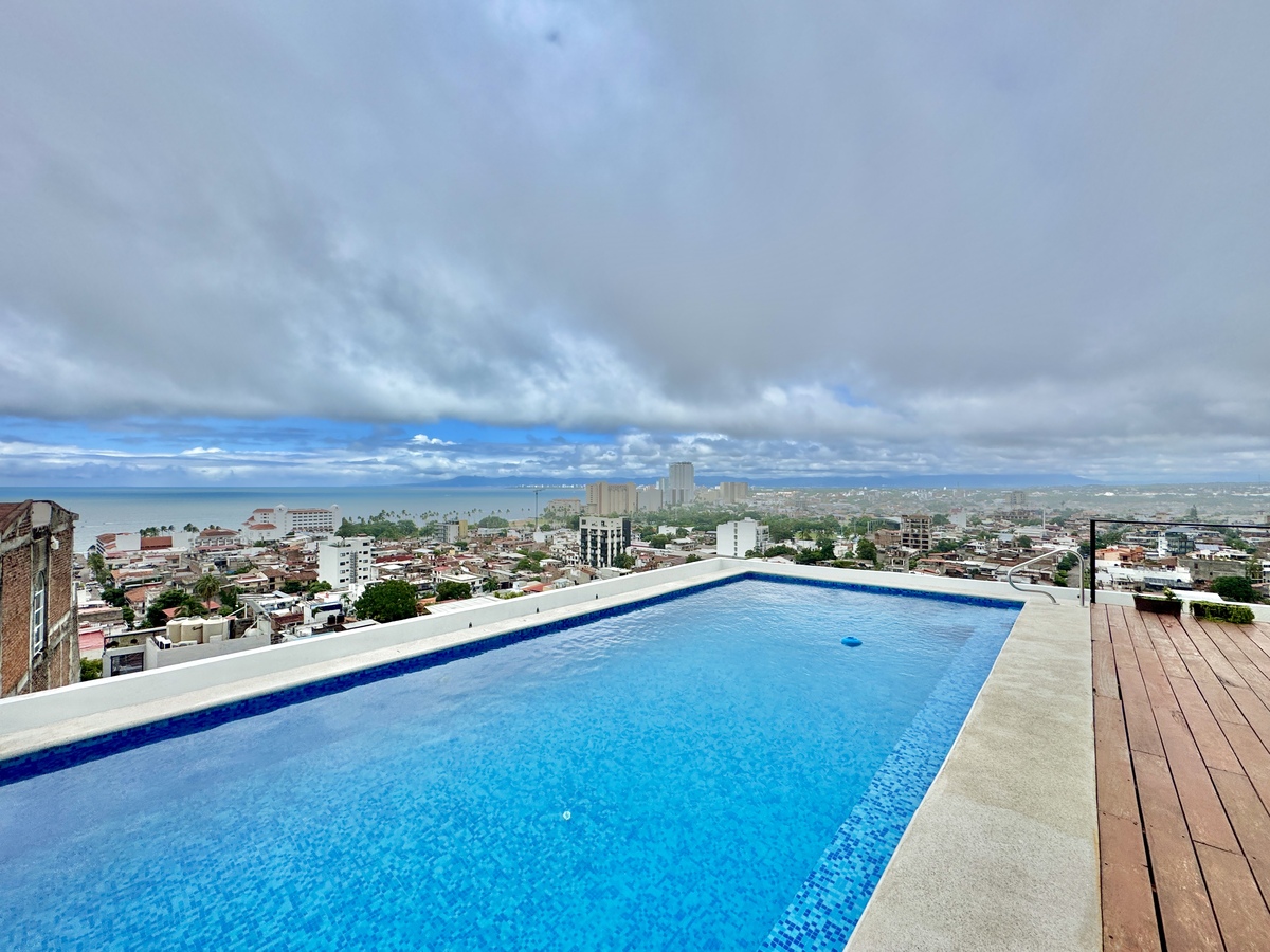 Totalmente amueblado con full AC., sala comedor y una recámara amplia, ambas áreas con vista, un baño completo, Roof Top con alberca y vista; un cajón de estacionamiento.