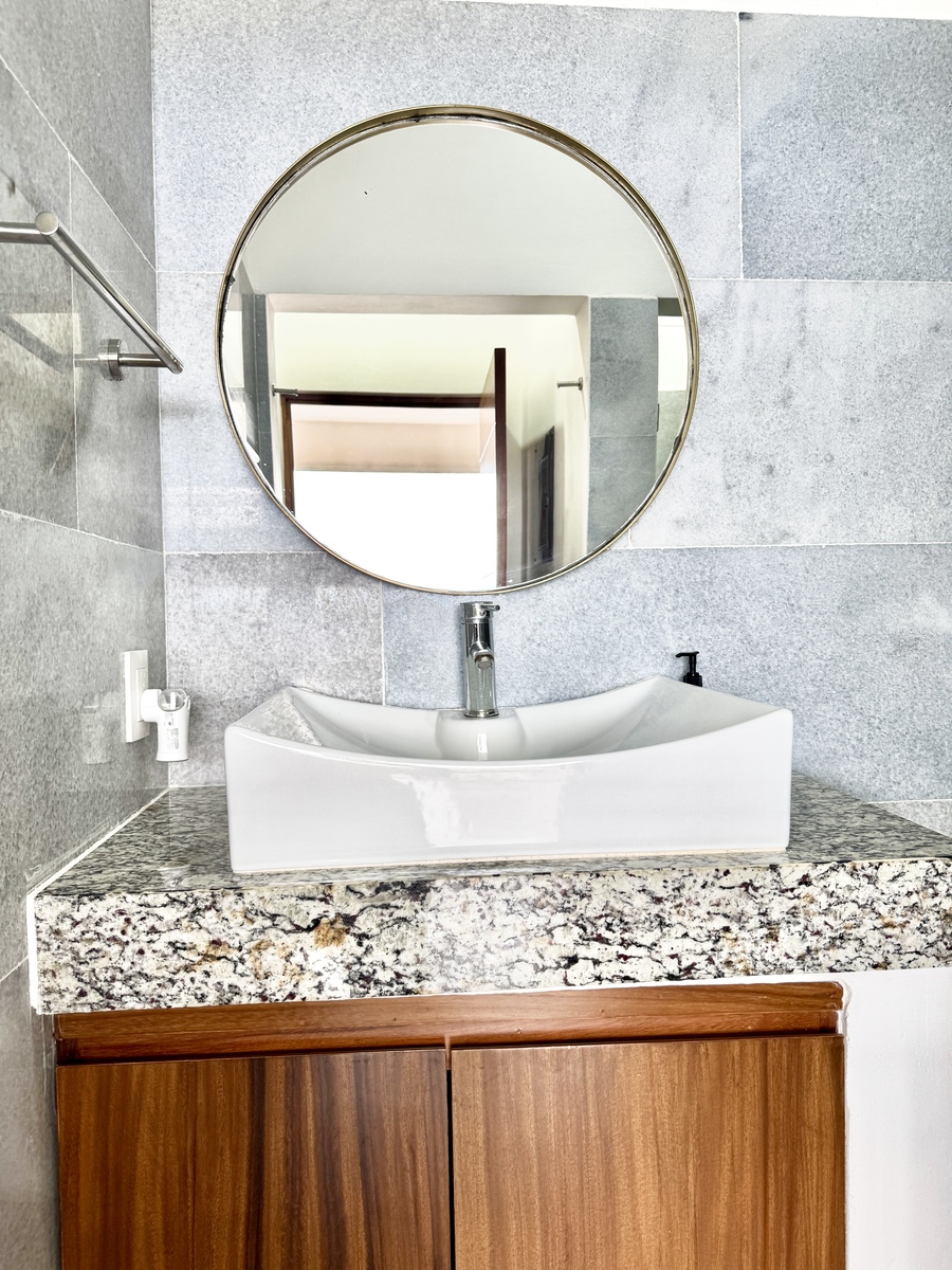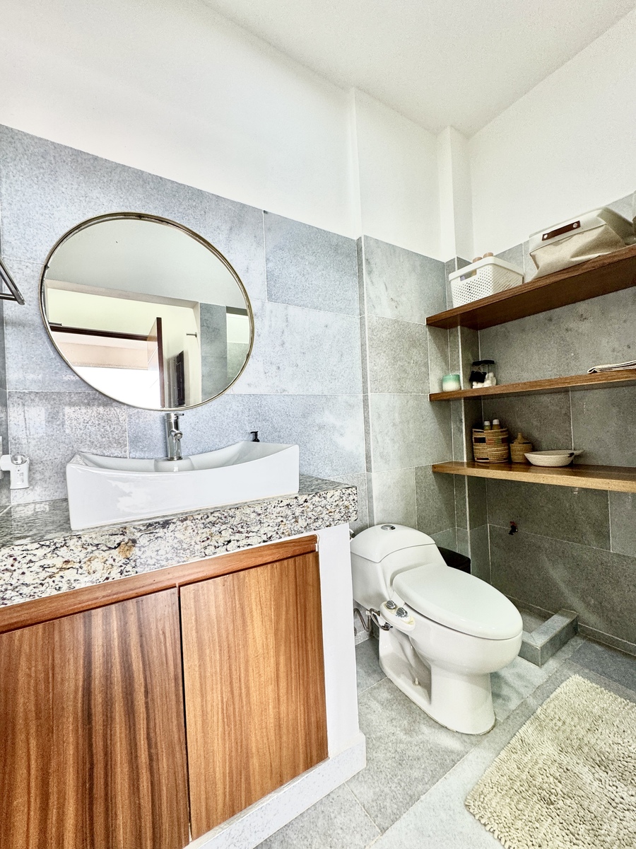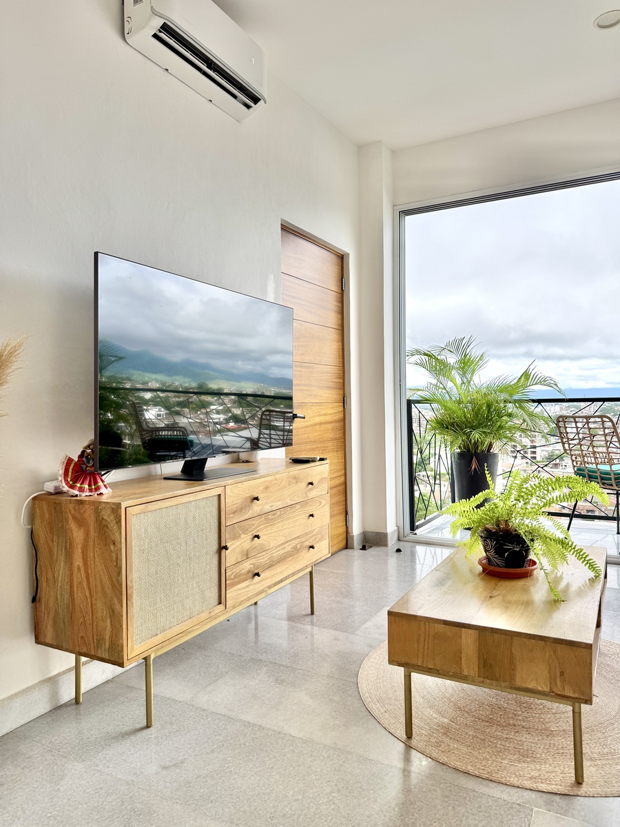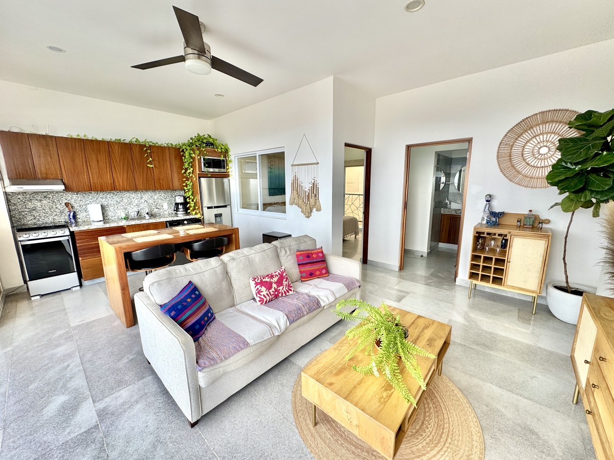 Totalmente amueblado con full AC., sala comedor y una recámara amplia, ambas áreas con vista, un baño completo, Roof Top con alberca y vista; un cajón de estacionamiento.