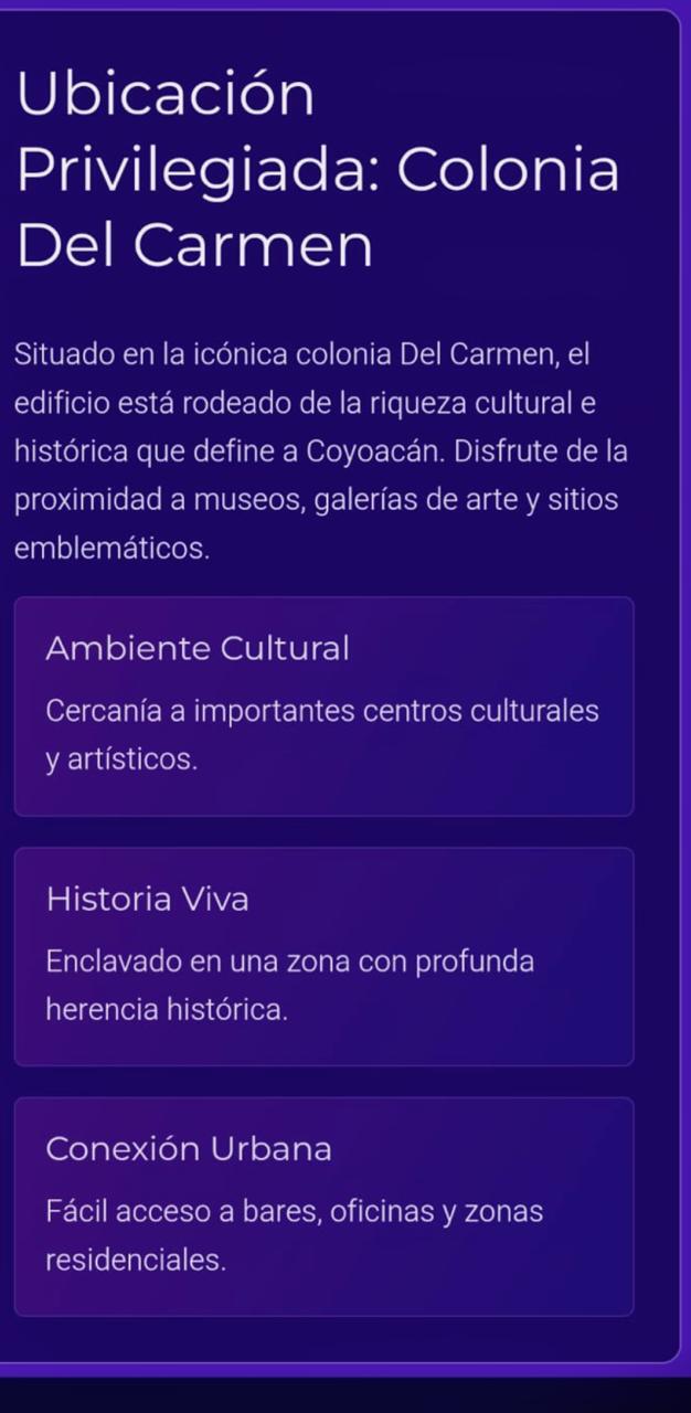 Ideal para renta tradicional o renta corporativa Rentas desde los $25,000 pesos cada departamento 1 oficina en la planta baja con estacionamiento. muy cerca Centro de Coyoacán, a minutos de Miguel Ángel de Quevedo y División del norte. OPORTUNIDAD DE INVERSION EN ZONA DE ALTA DEMANDA DE VIVIENDA TURISTICA Y DE PODER ADQUICITIVO ALTO,EXCELENTE PLUSVALIA, INVIERTE EN ESTE LUGAR DEL CENTRO DE COYOCAN TAN COTIZADO .