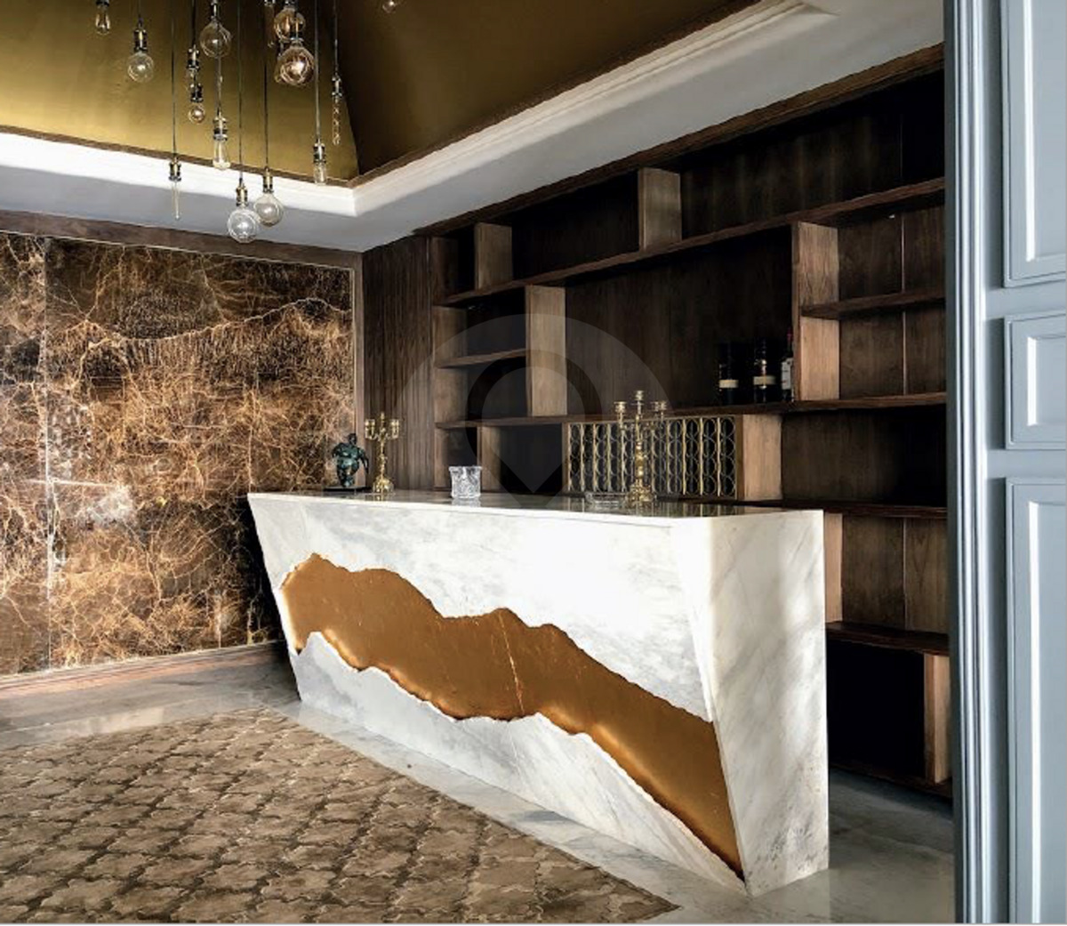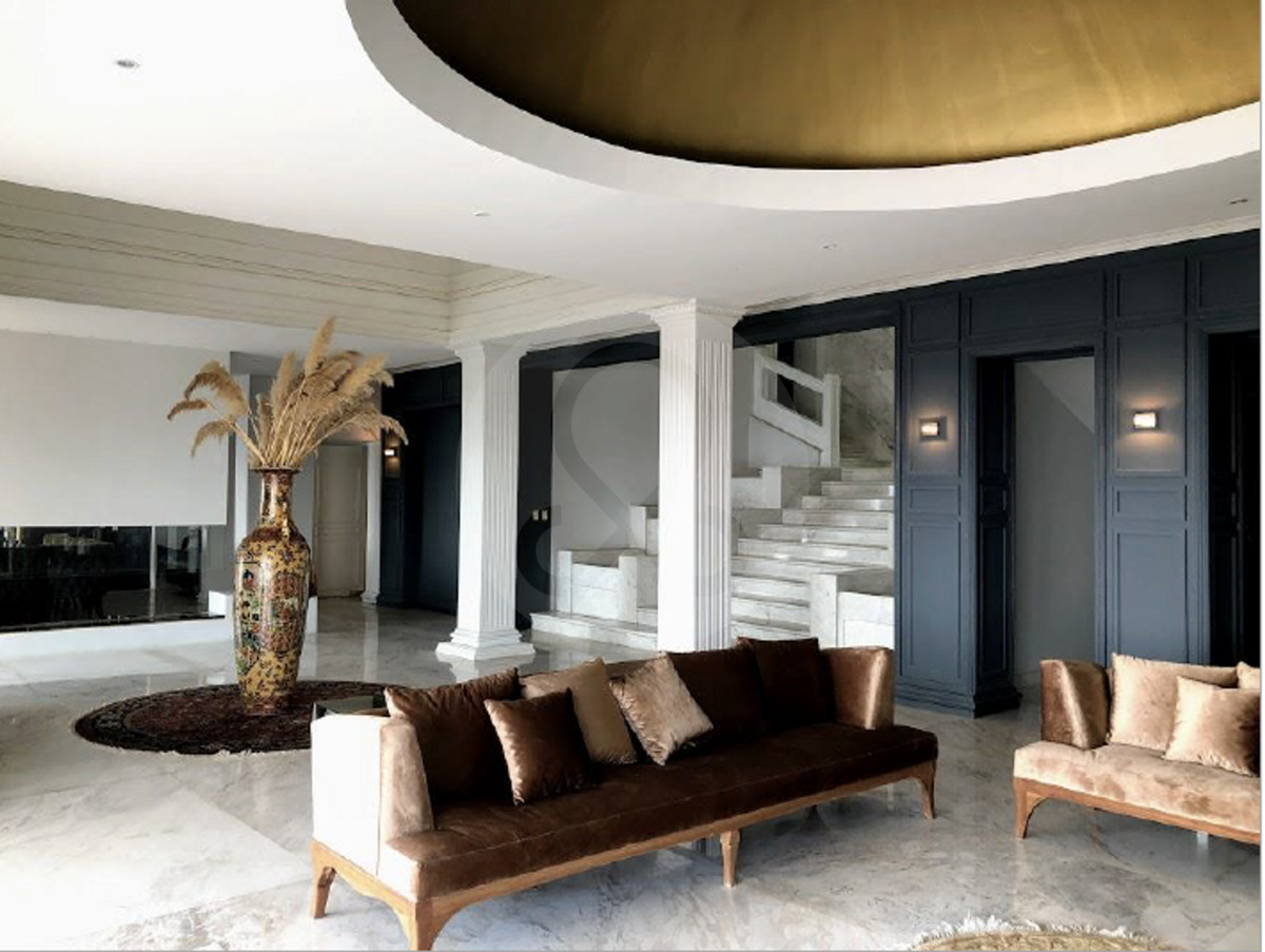 Vestíbulo a doble altura, despacho con medio baño. Medio baño de visitas, sala, comedor, bar, cocina, antecomedor, despensa, terraza con mesa de tepanyaki.