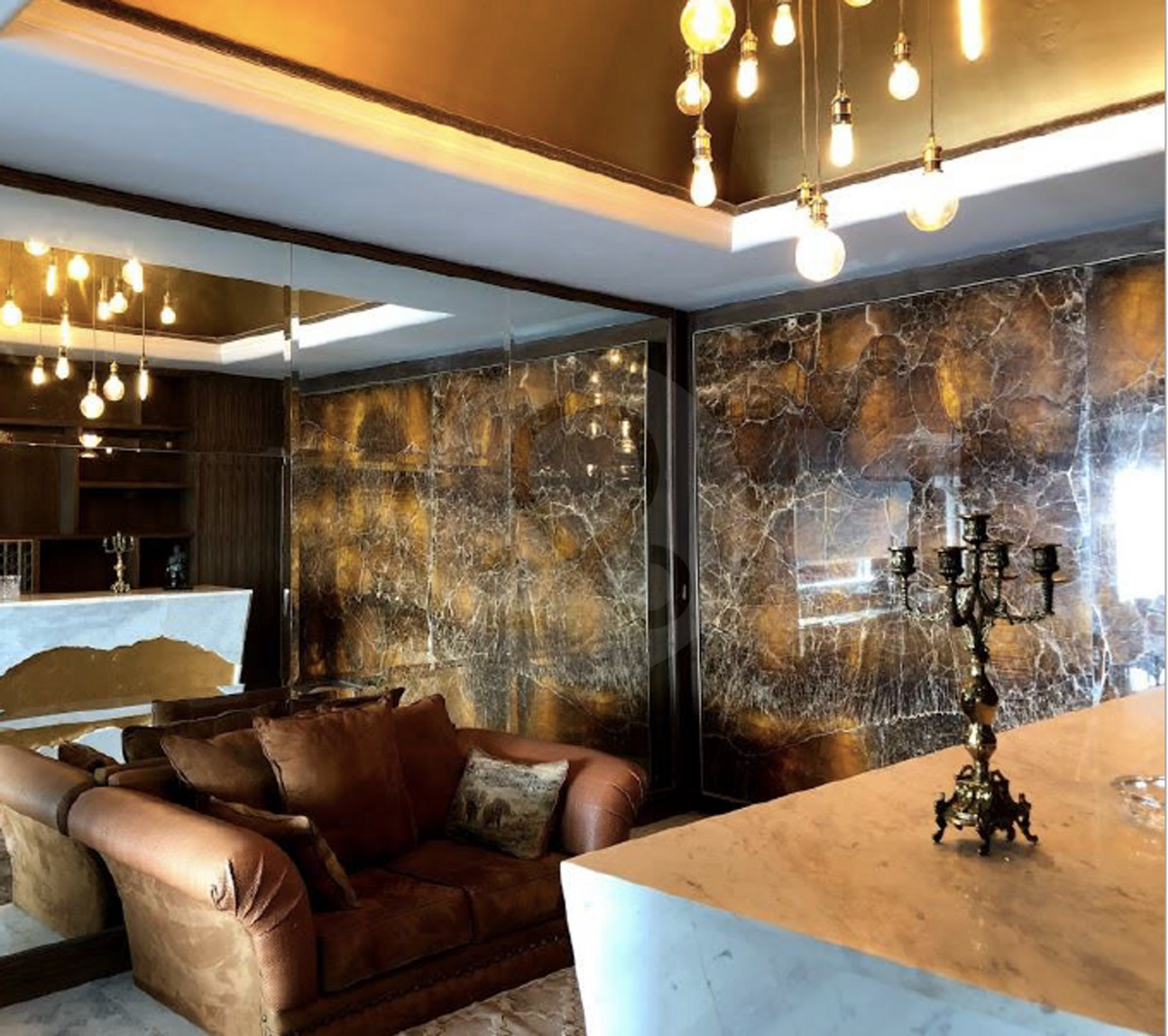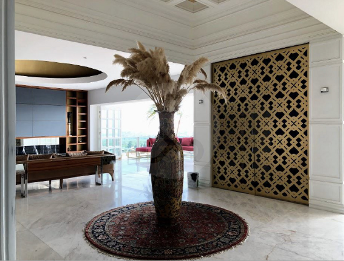Double-height foyer, office with half bath. Guest half bath, living room, dining room, bar, kitchen, breakfast nook, pantry, terrace with tepanyaki table.