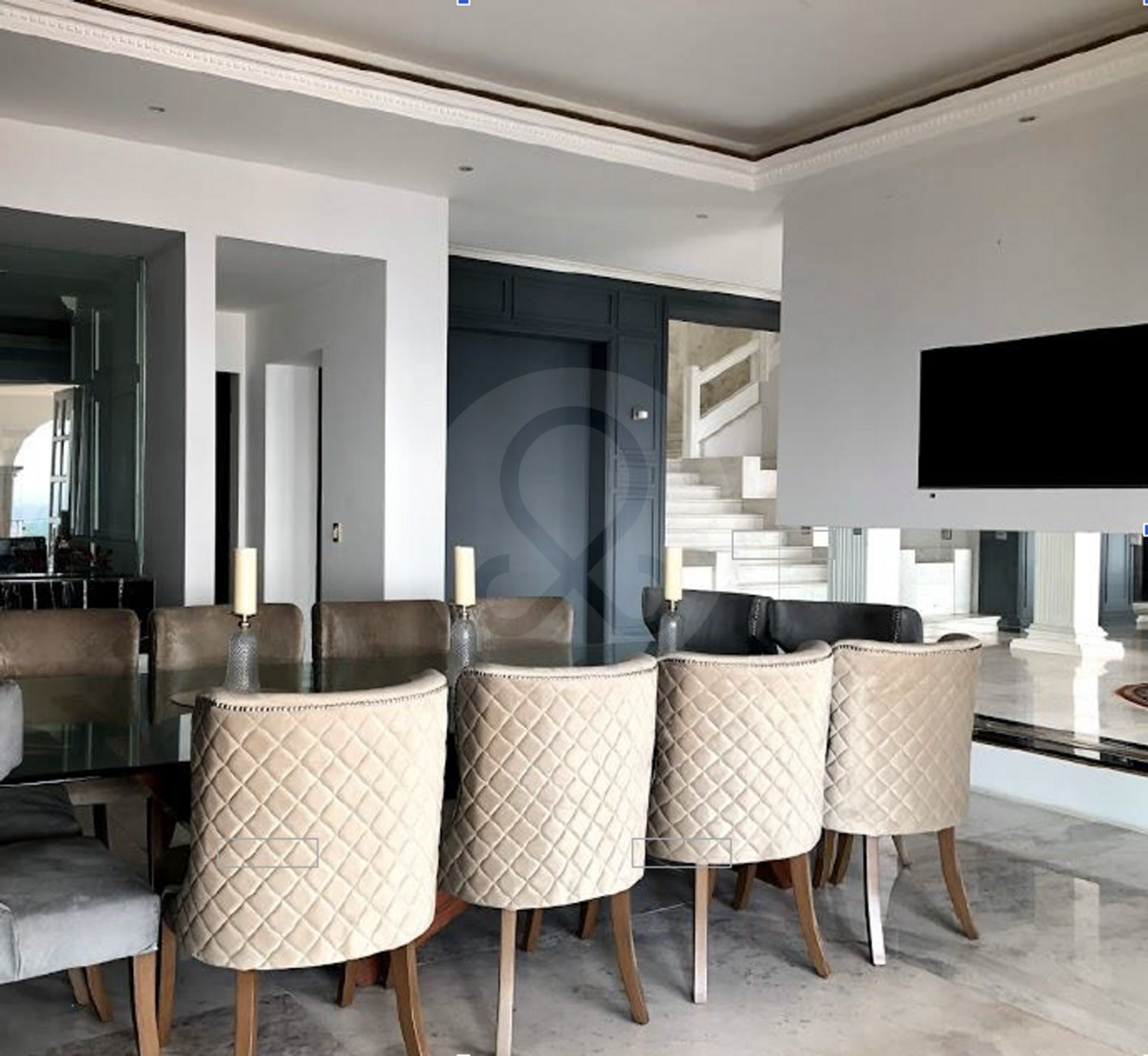 Salón de juegos con dos baños, sala de proyecciones, bar. Alberca con dos baños, spa, área de costura, 3 cuartos de servicio, jardín de 200 m (se puede ampliar). Área de exhibición para coches y departamento independiente en obra blanca en dos niveles de 400 m2 con gimnasio, dos baños y suite de visitas. Salón de fiestas para 200 personas con escenario, cocineta y dos medios baños. Bodega. 8 lugares de estacionamiento techados.