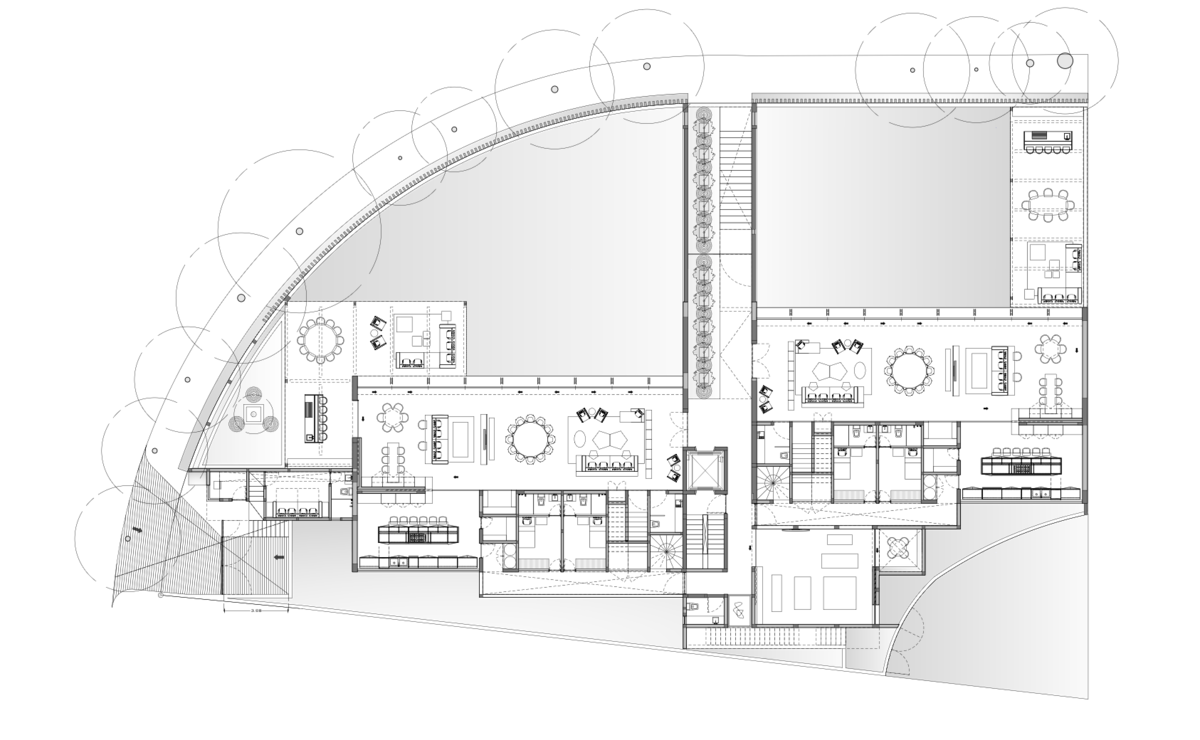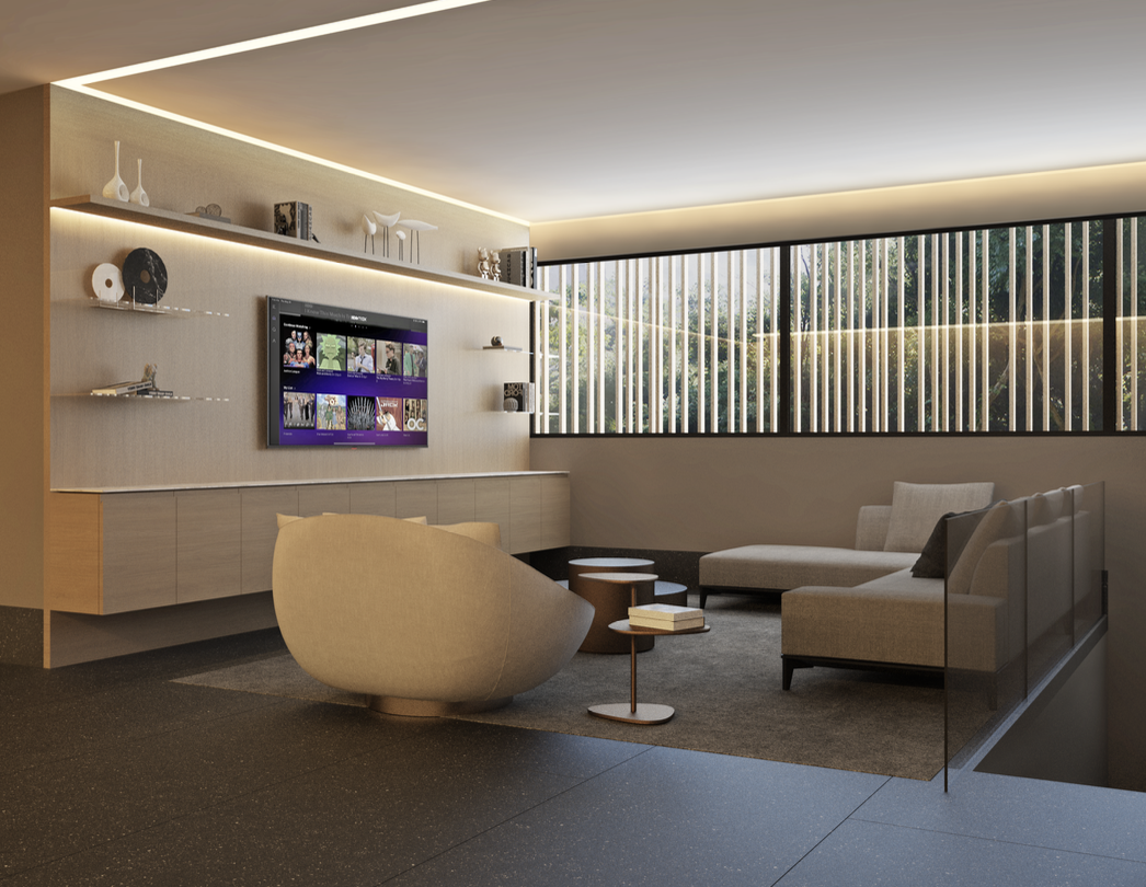 En el primer nivel un amplio espacio de poco más de tres metros de altura con iluminación natural resguarda la sala de estar, el comedor, el bar y el family room con preciosas vistas