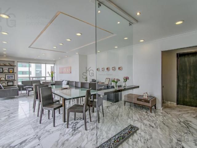 Elevador directo al piso, gran sala comedor y baño de visitas. Amplio family, 3 recamaras cada una con su vestidor y baño completo.