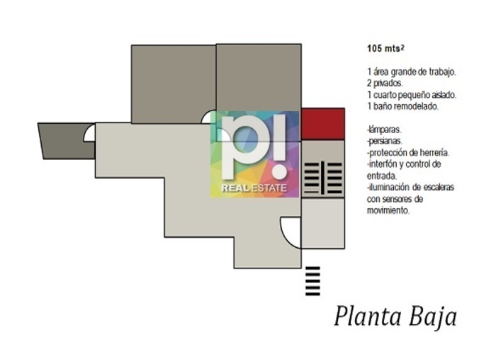 GROUND FLOOR: 105 m2. Its rental price is $11,000 + $1,000 maintenance + VAT and for sale $1,550,000 with a large work area, 3 private offices, and 1 bathroom. With lamps, blinds, and metal protection on windows.