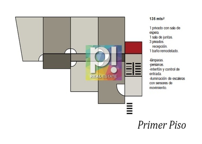 FIRST LEVEL: 135 m2. Its rental price is $11,000 + $1,000 maintenance + VAT and for sale $1,550,000 with 1 private office with waiting room, 1 meeting room, 3 private offices, and a bathroom.