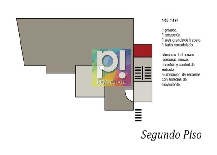 SEGUNDO NIVEL: de 135 m2. Su precio de renta es de $11,000 + $1,000 de mantenimiento + IVA y de venta $1,550,000 con 1 privado, 1 recepción, área grande de trabajo y 1 baño.
