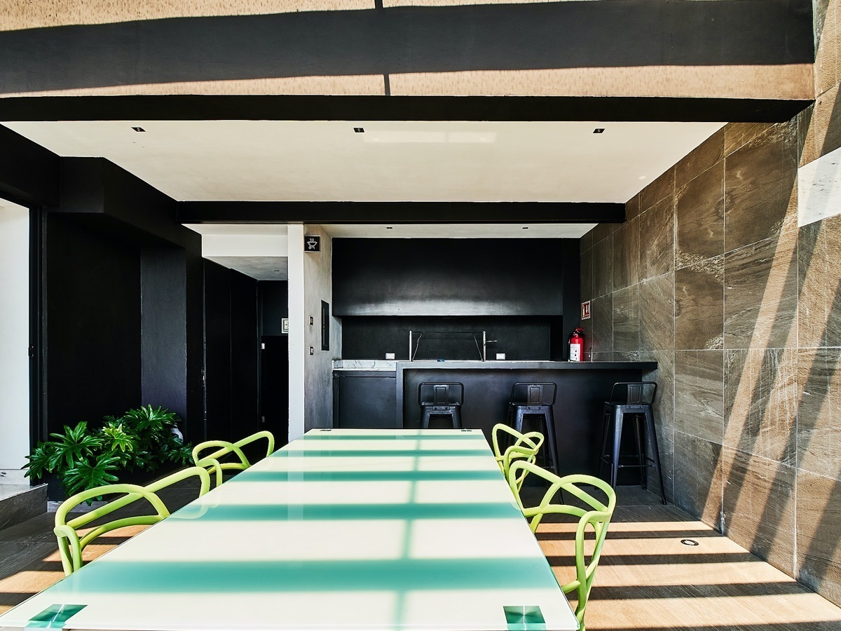 La alberca al aire libre esta en este mismo nivel y tiene asador y mesas. En la planta baja tiene un gimnasio, salón inglés, sauna y vapor.