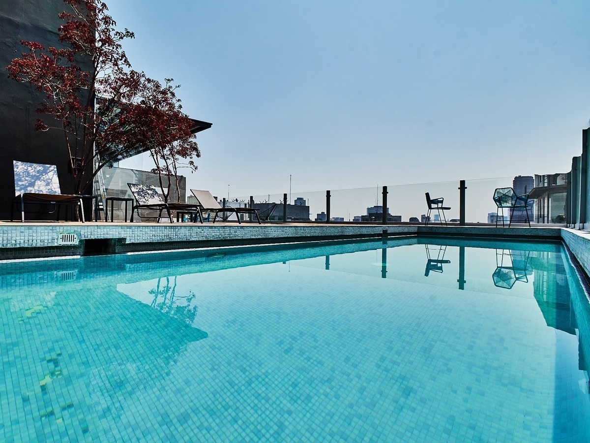 The outdoor pool is on this same level and has a grill and tables. On the ground floor, there is a gym, English lounge, sauna, and steam room.