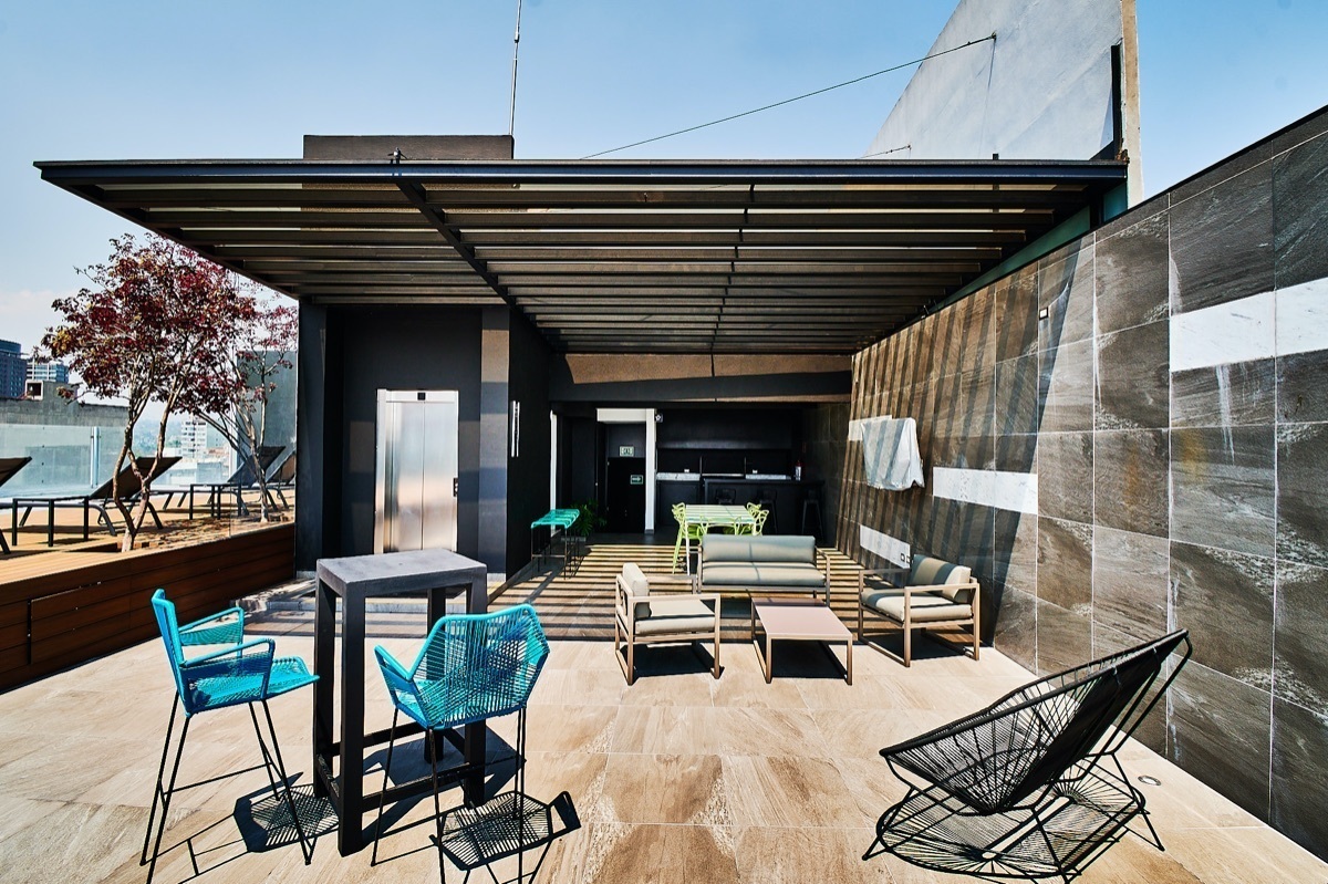 El roof garden esta en el 3er nivel y es del tamaño del departamento, tiene área techada con lavabo, refrigerador, barra, 2 baños y la terraza abierta con asador y vista panorámica.