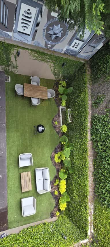 Social area with built-in furniture in fine woods and sideboard with quartz countertop, integrated into a garden of approx. 50 m²