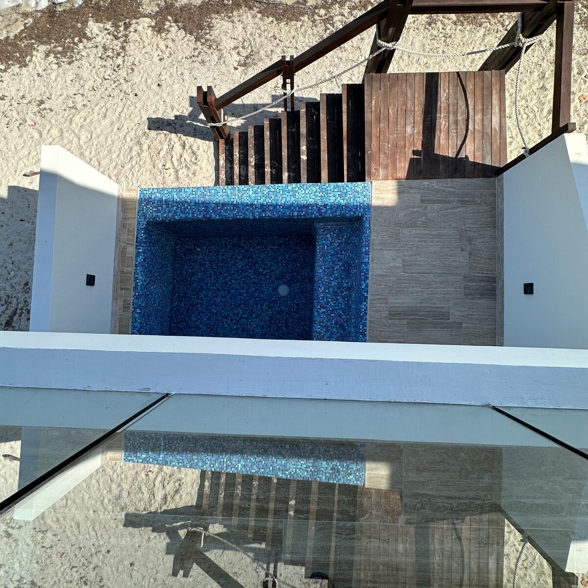 - Piscina con acabado en mosaico veneciano en color azul.