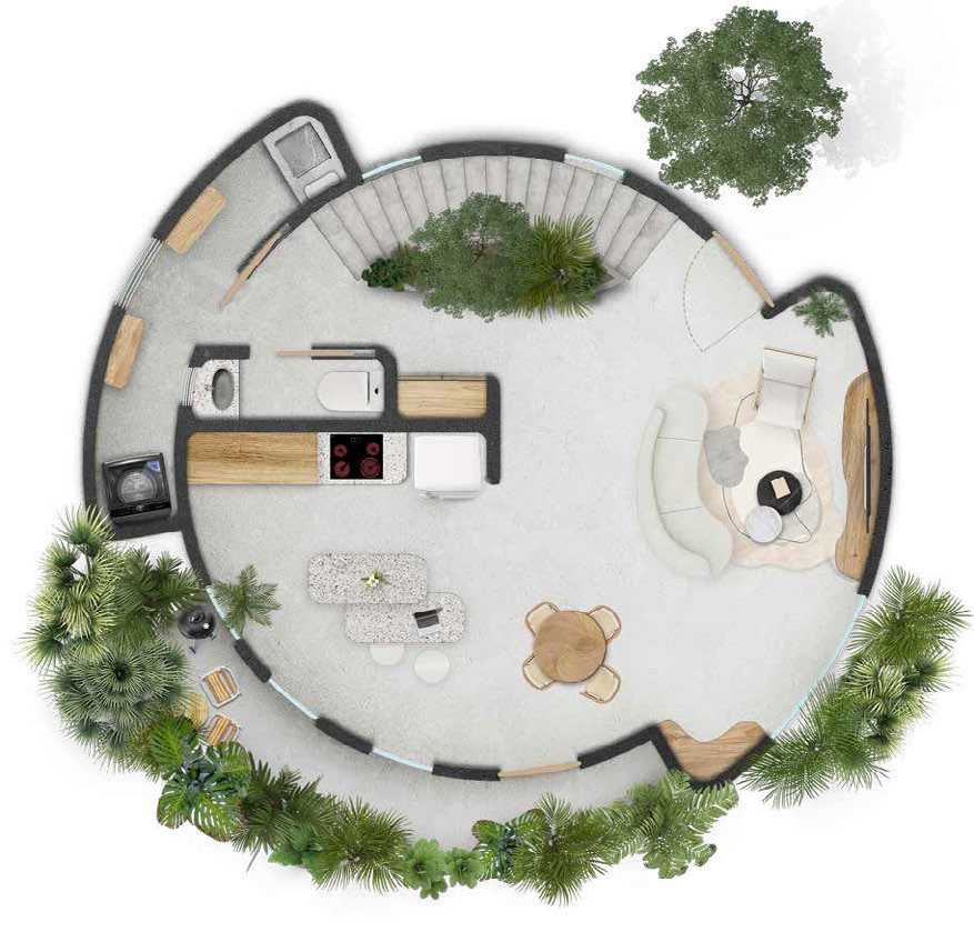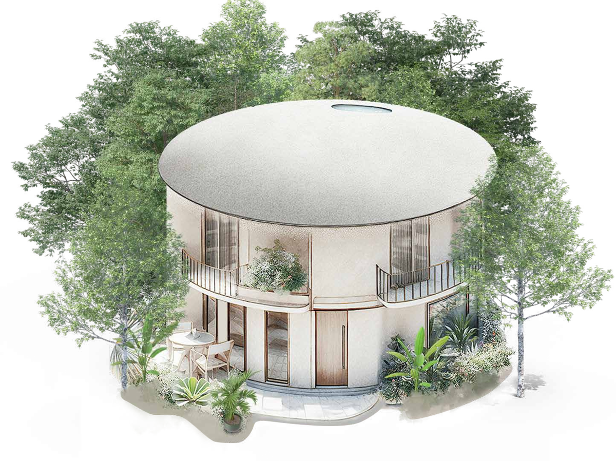Las villas son amplias esculturas orgánicas habitables de 2 niveles, con 2 dormitorios y alturas de hasta 7 mts.