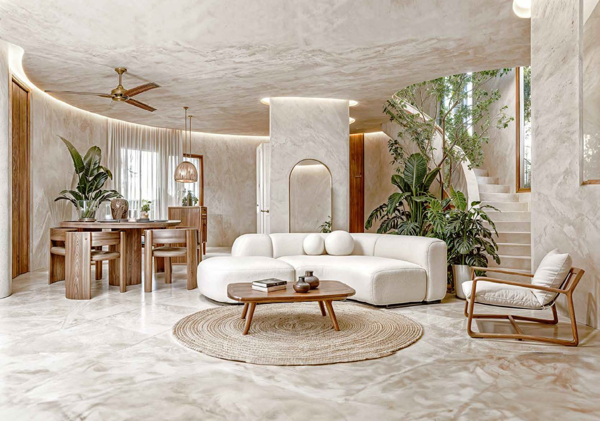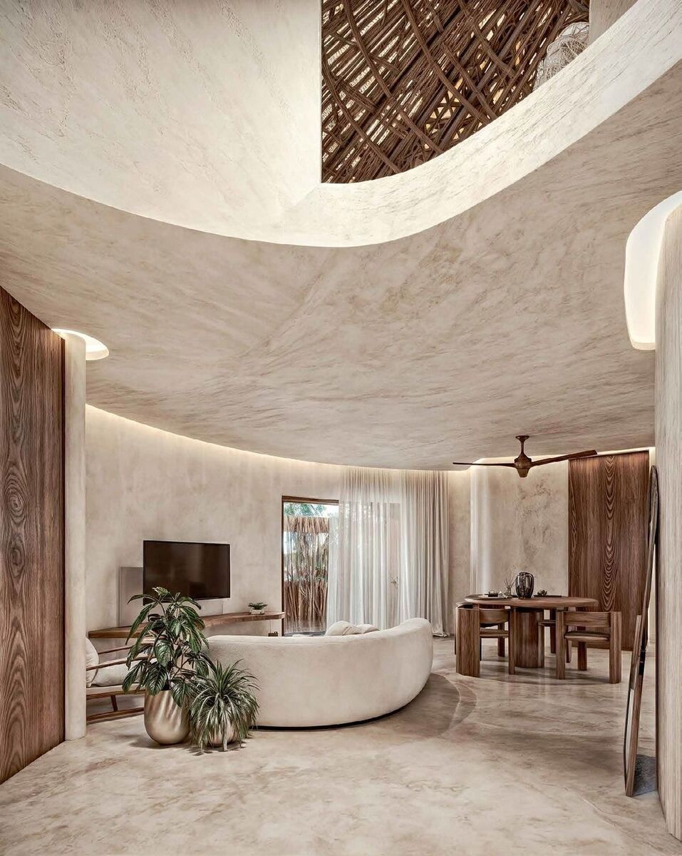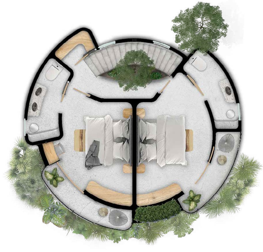 The villas are spacious habitable organic sculptures of 2 levels, with 2 bedrooms and heights of up to 7 meters.