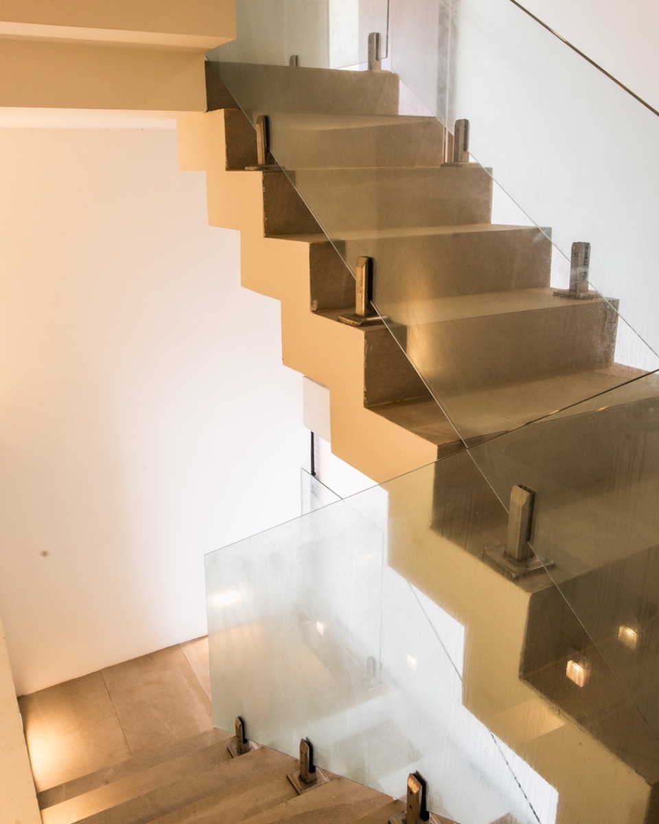 Detalles de rollizos de madera en la terraza Barandales en la escalera de vidrio templado Canceles de vidrio templado en cada baño