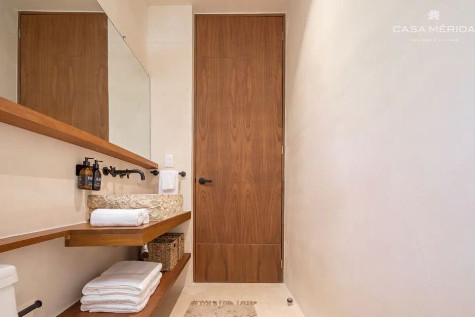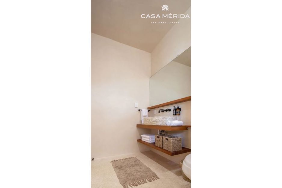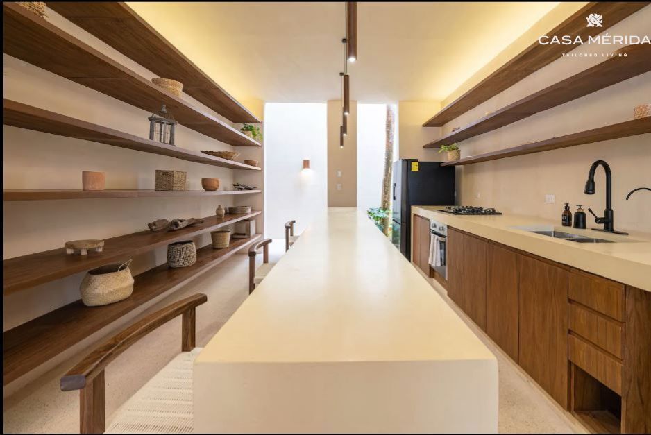 Los acabados incluyen una impresionante carpintería, paredes de chukum y suelos de cemento-chukum pulido en toda la casa.