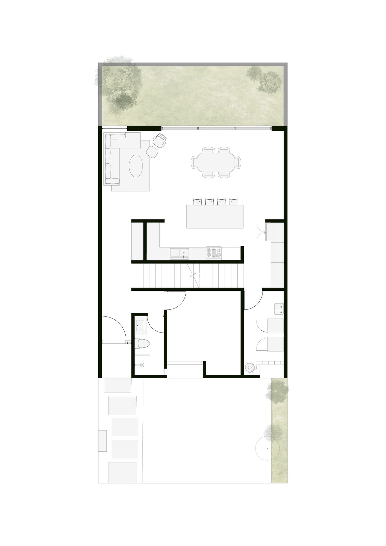 Ground Floor: Covered garage for 2 cars, Guest room or study, Full bathroom, Living room, Dining room, Kitchen with island, Laundry room, Garden and terrace, cistern