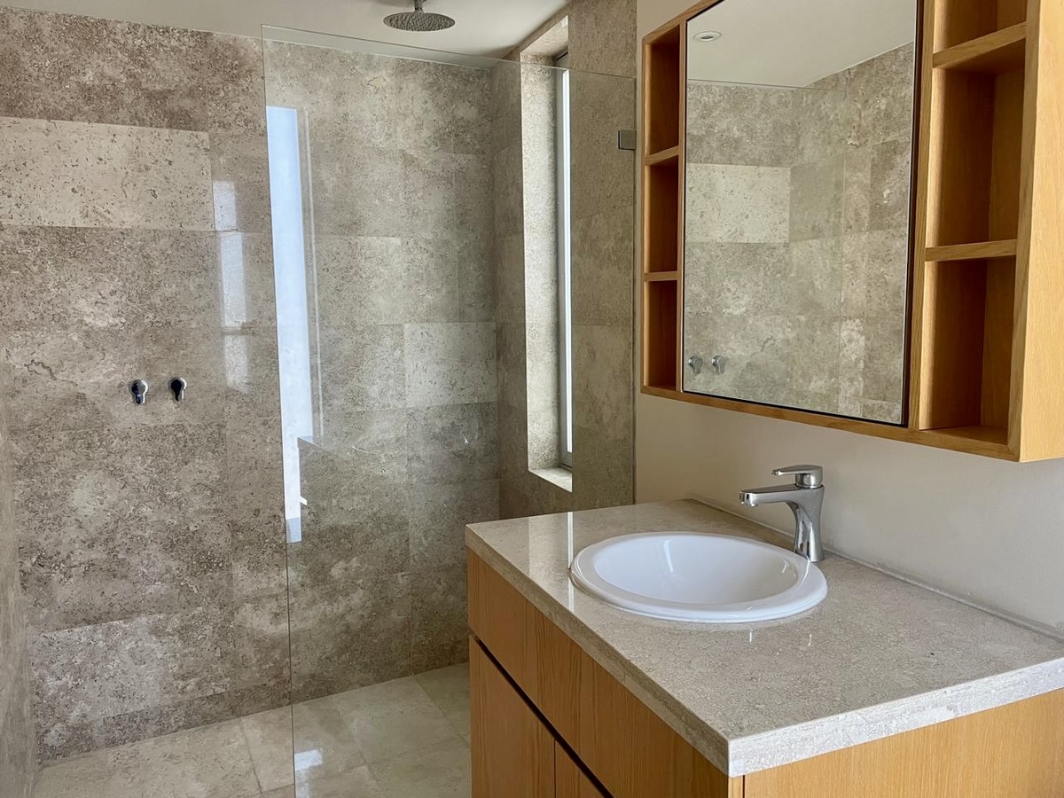 Recámara principal con clóset tipo vestidor y baño privado con cancel de cristal templado