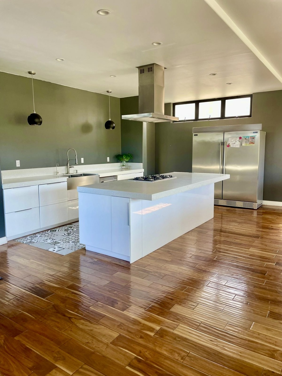 La cocina moderna, equipada con una elegante barra de cuarzo y amplia alacena, se integra con el comedor y la sala, donde las ventanas abatibles permiten fusionar el interior con el jardĂn, creando un ambiente ideal para socializar y disfrutar.