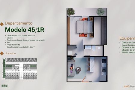 SALE MERIDA APARTMENT -INITIAL CORREA RACHO- MOD.45 PLUS. (1BED.) DIAZ ORDAZ, YUC.