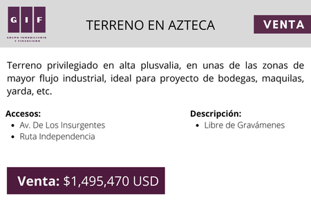 INVESTOR SERVICE | INDUSTRIAL LAND IN AZTECA| 2,320 M2 | $1,495,470 DO