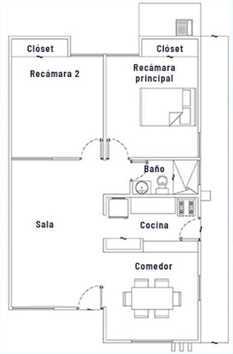 2 recámaras, ambas con aire acondicionado, closet con repisas de concreto y ventilador.