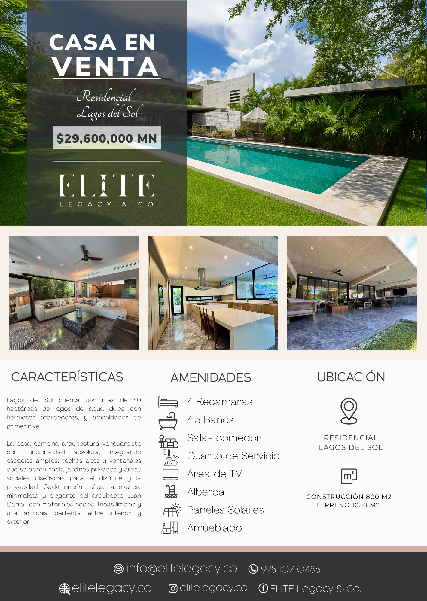 La casa combina arquitectura vanguardista con funcionalidad absoluta, integrando espacios amplios, techos altos y ventanales que se abren hacia jardines privados y áreas sociales diseñadas para el disfrute y la privacidad. Cada rincón refleja la esencia minimalista y elegante del arquitecto Juan Carral, con materiales nobles, líneas limpias y una armonía perfecta entre interior y exterior. 4 recámaras de diseño exclusivo.Sala de cine y bar privado.