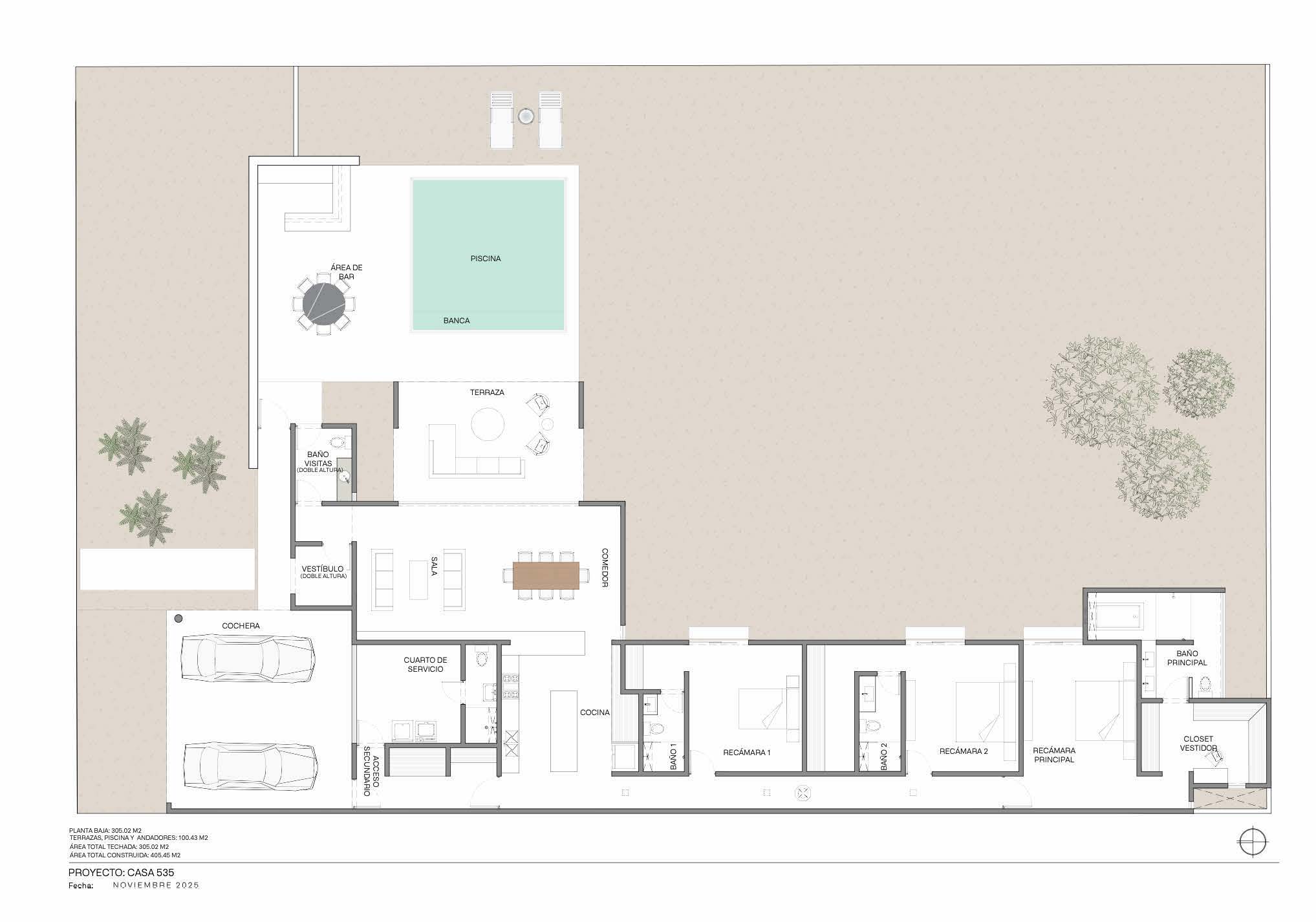 Terraza exterior para piscina con barra, tarja y meseta de servicio (área no techada)