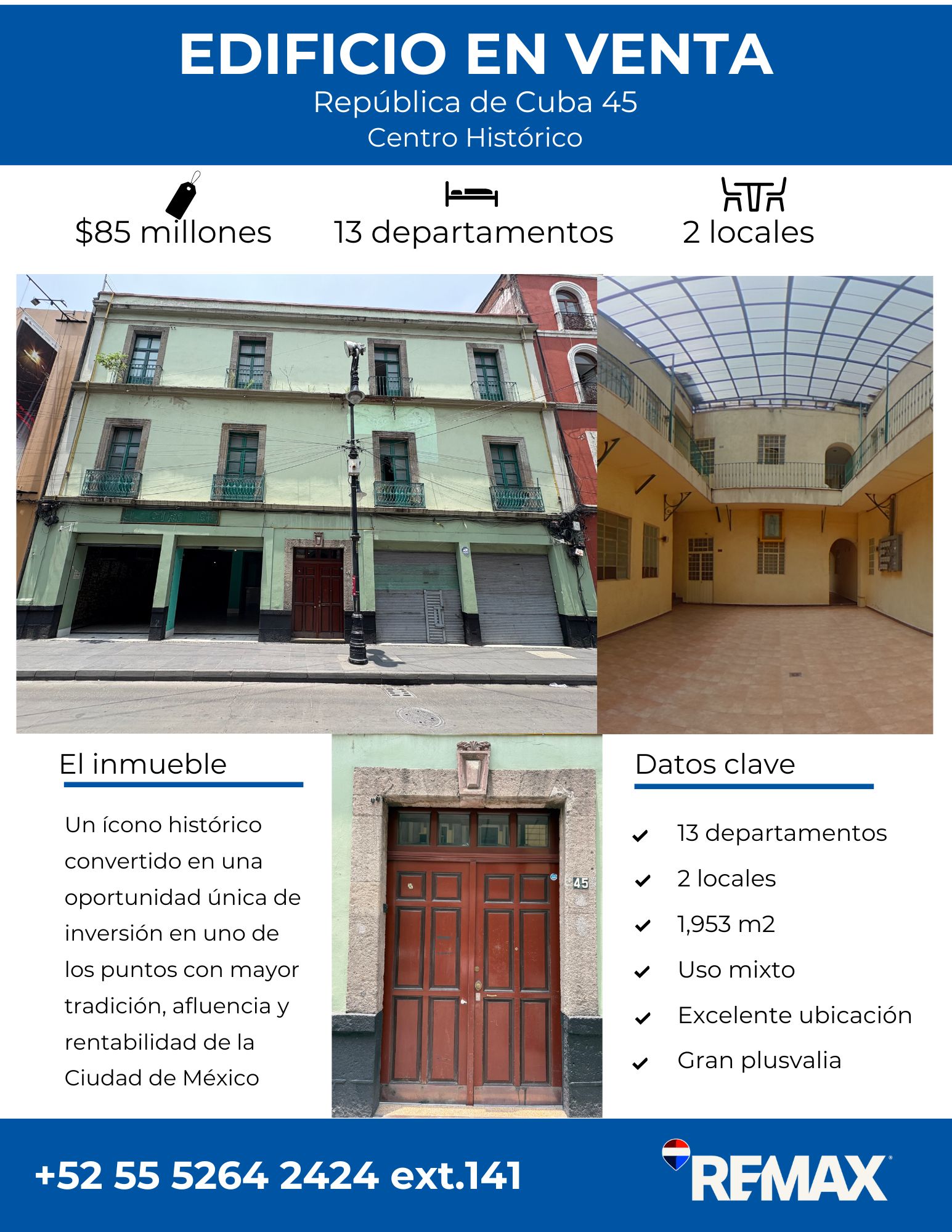 En venta edificio de uso mixto con 1,953 m² de construcción, ubicado en República de Cuba 45, a unos pasos de Plaza Garibaldi, Bellas Artes y el Zócalo capitalino.