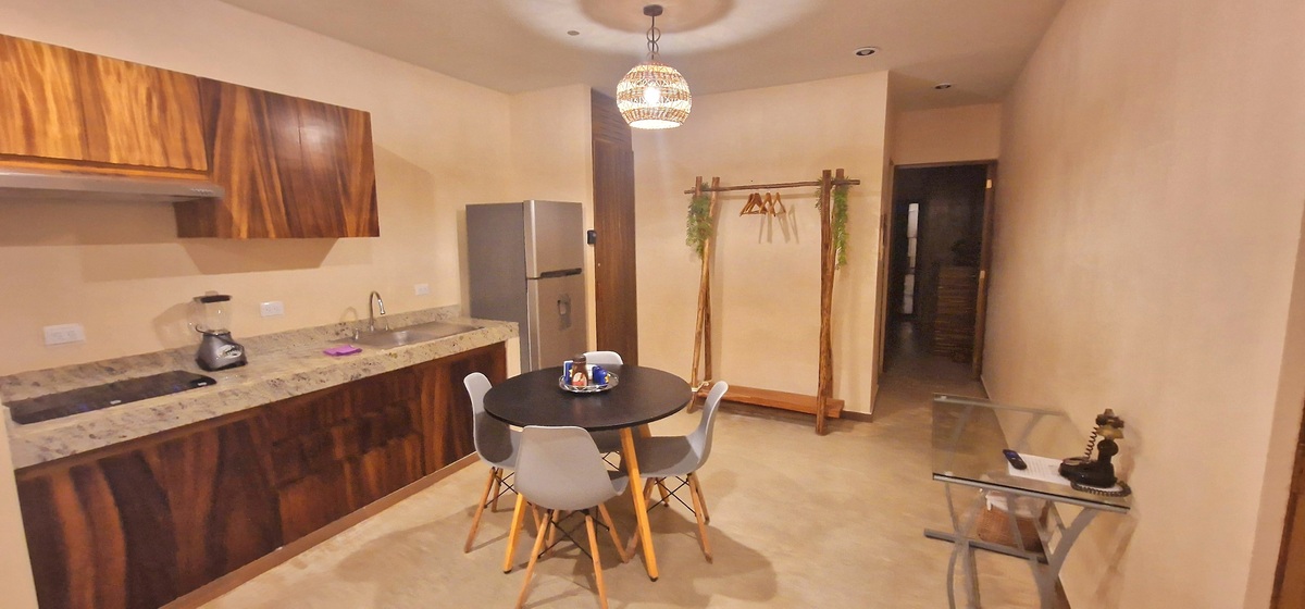- cocina equipada, abierta, plancha de granito en la