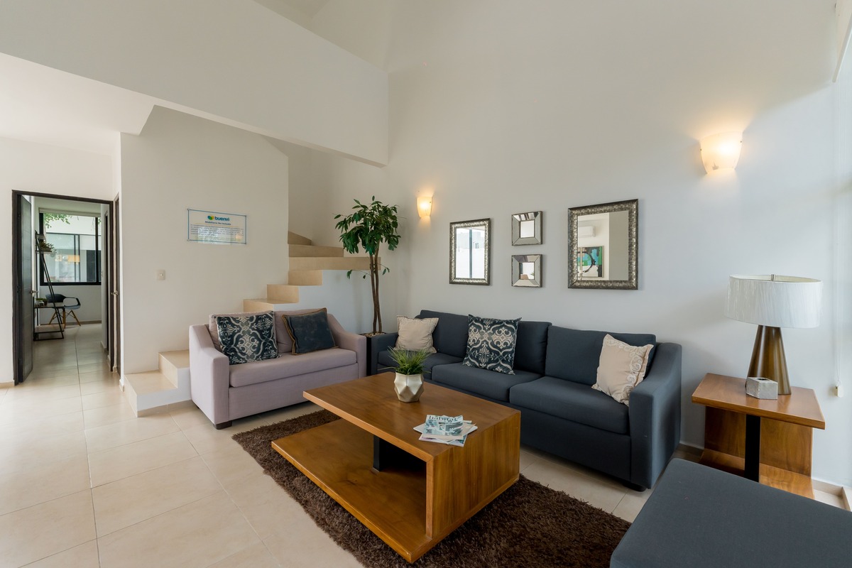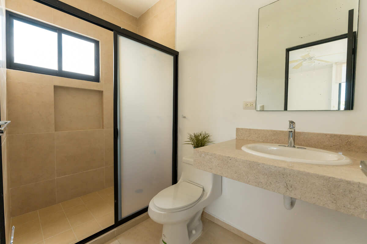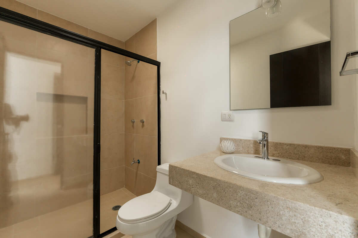 • Una recámara con área de closet y baño privado completo con mesetas en mármol.