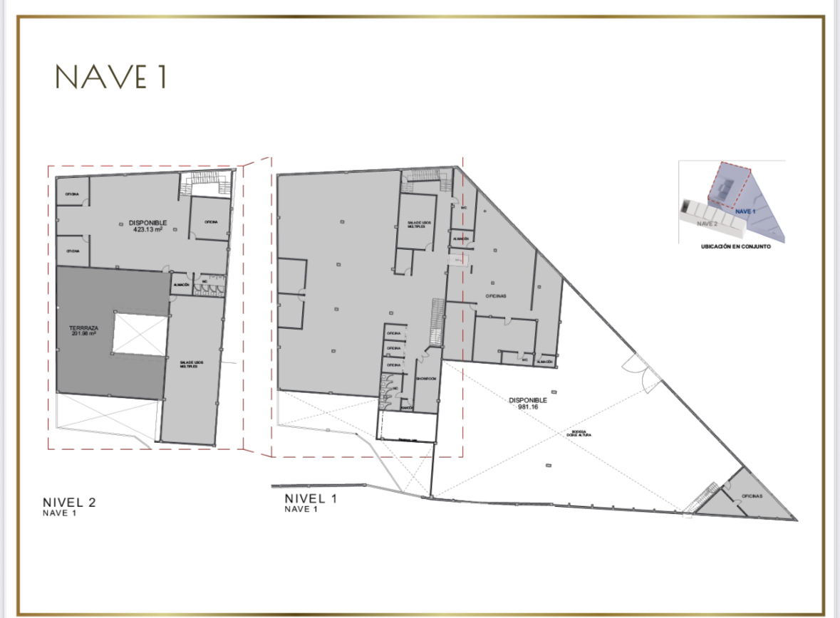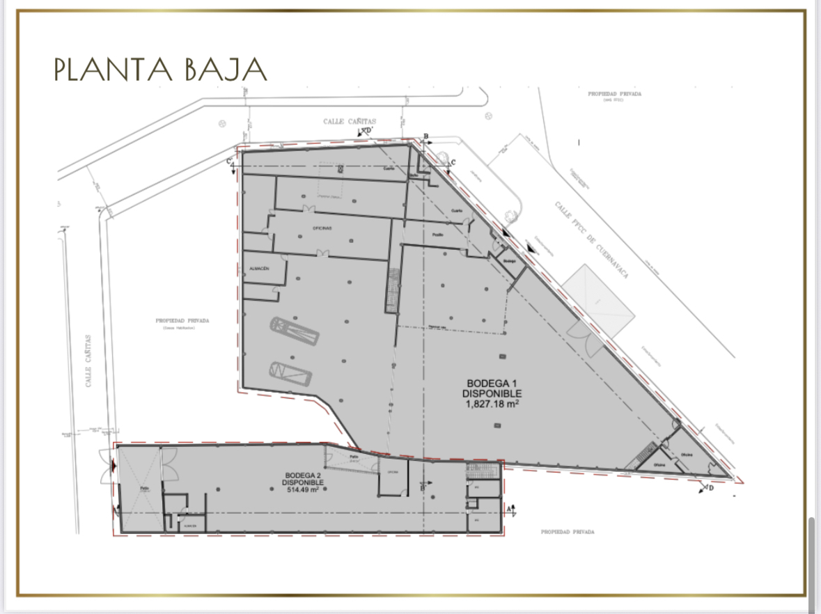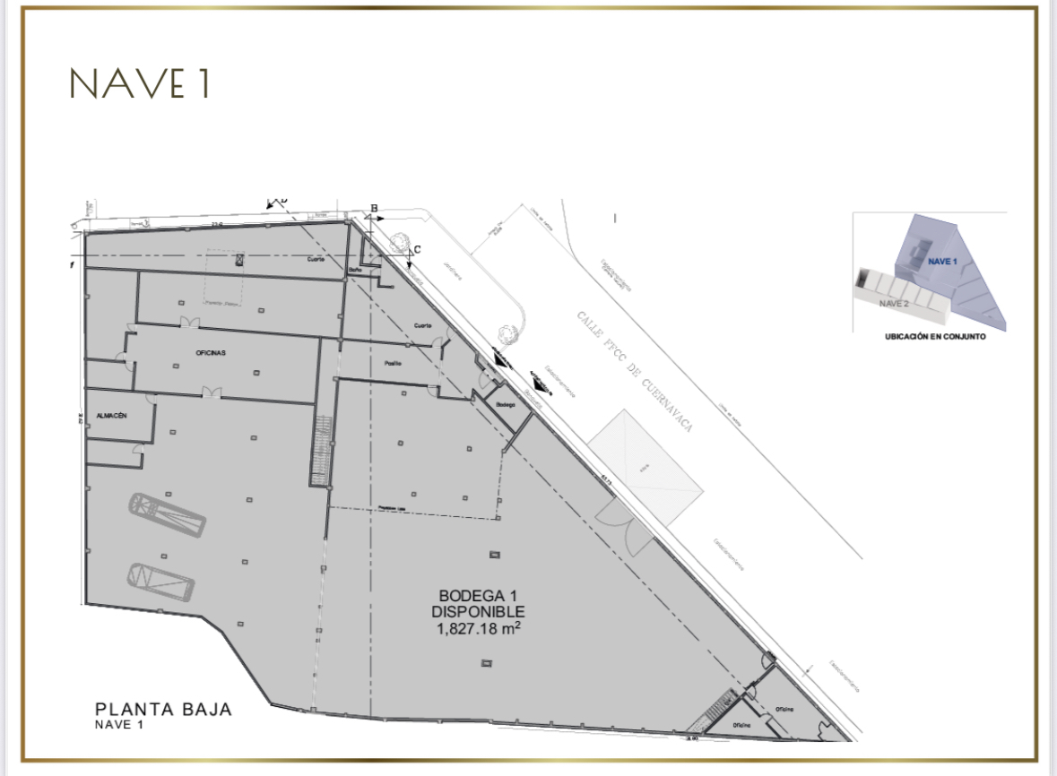 Ubicada sobre av principal. Con superficie de 1,827m2. Altura 2.4 a 6metros Estacionamiento. Cuenta con area abierta, oficinas, baños. En el mismo predio hay otra bodega con 510m2