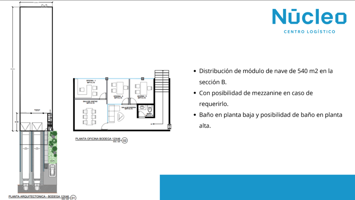 Ponemos a tu disposición un área de 40 mil m2 de nave, divididos en módulos que parten de los 540 m2, con posibilidad de área corporativa(oficinas) de hasta 80 m2 por módulo.