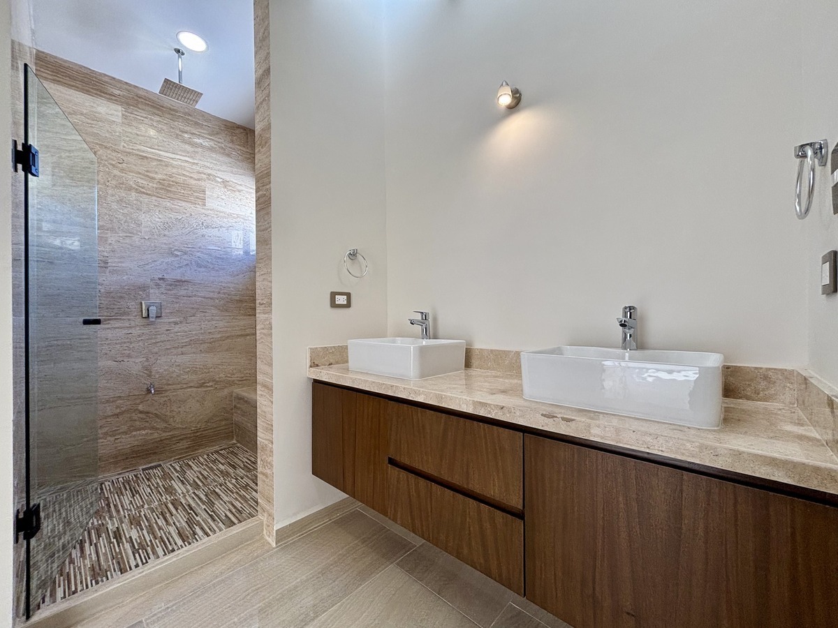 Mesetas de mármol en baños con lavabo de porcelana sobre cubierta y muebles de madera.