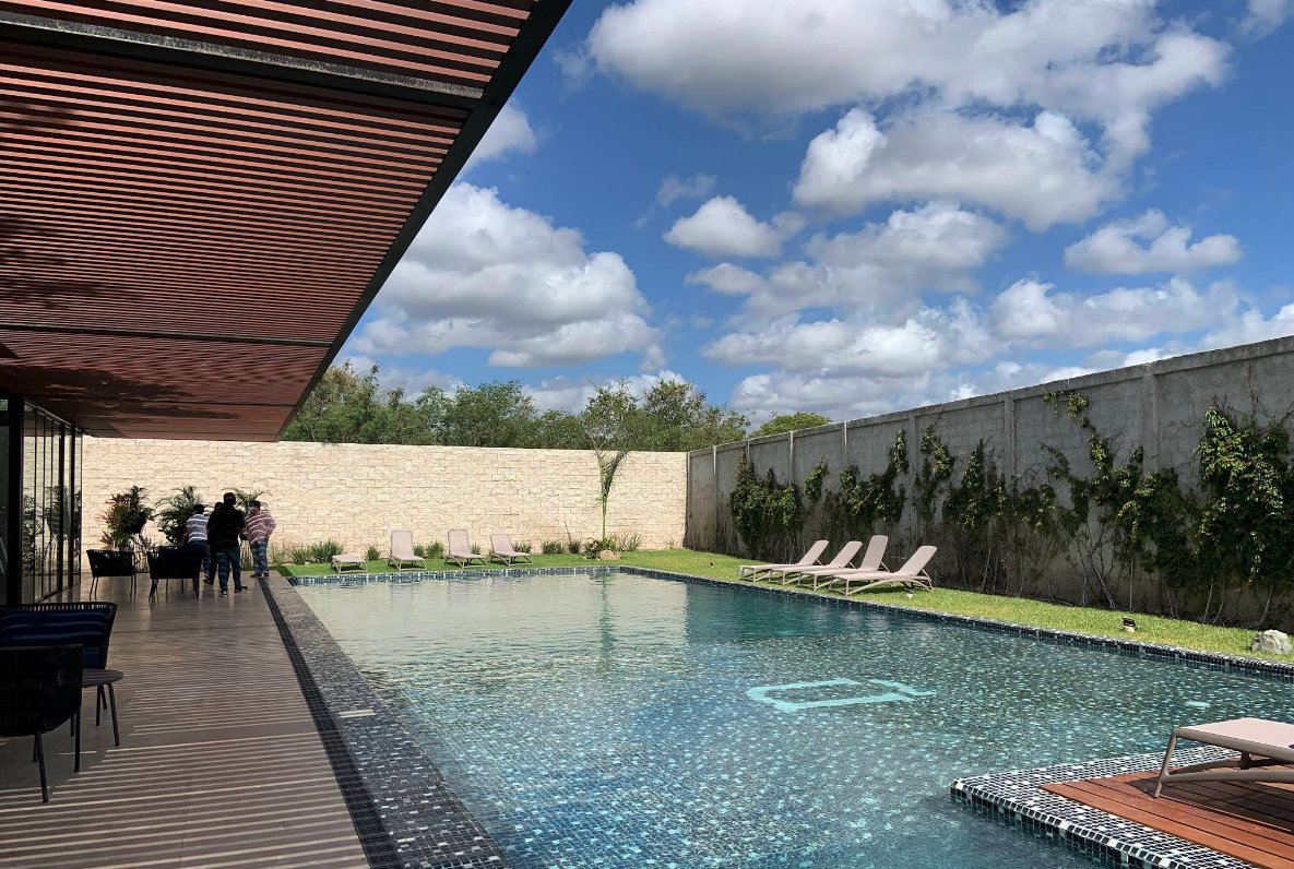 Piscina con acabado en chukum, cenefa de 15 cm de veneciano, luz de led que cambia de color.