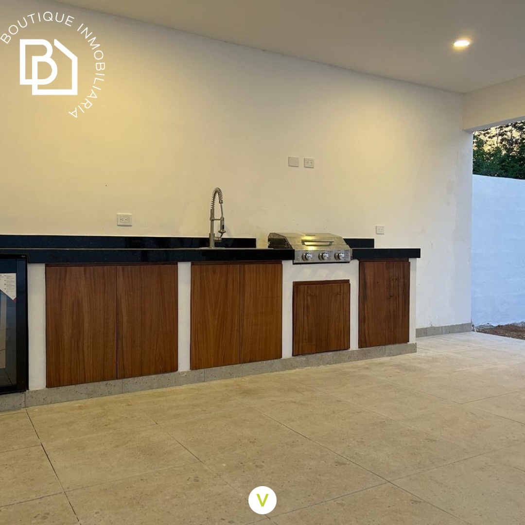 Terraza techada con barra y acabado en granito, asador, tarja y cava enfriador