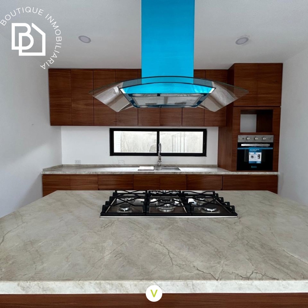 Cocina equipada, barra de granito con alacena, parrilla, horno y campana