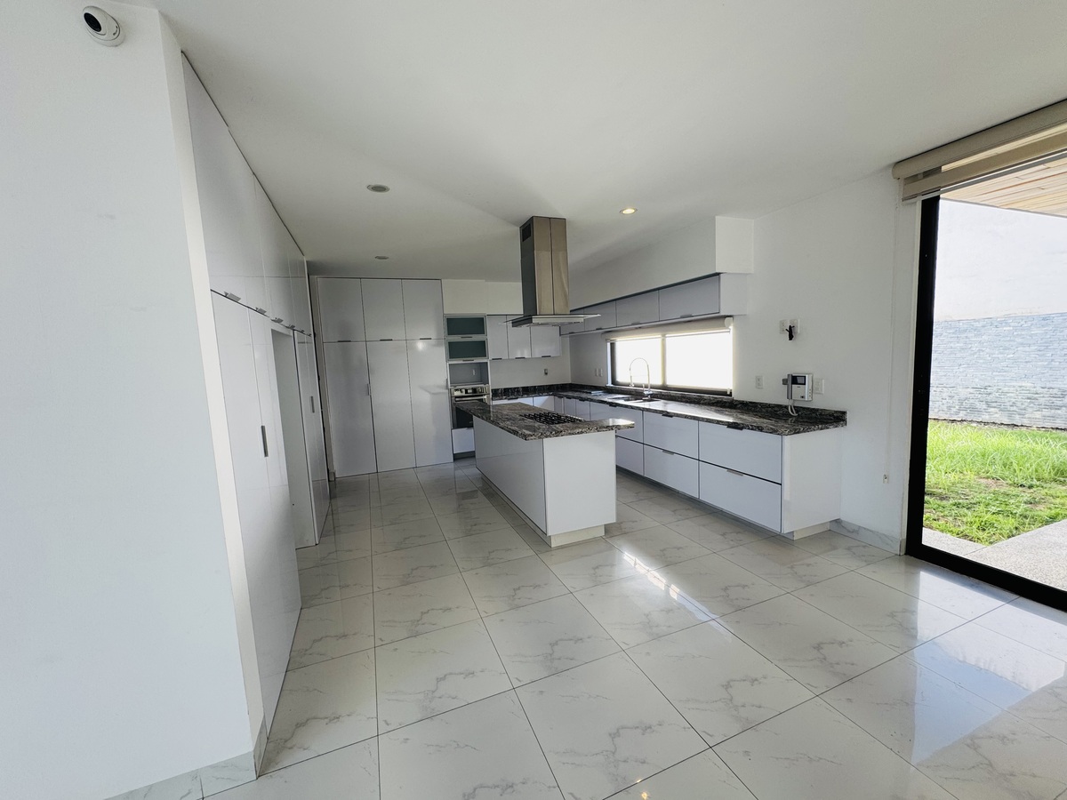 Planta baja: 1/2 baño, estudio, sala a doble altura, comedor, cocina con isla y cubierta de granito, terraza techada, jardín con riego, cuarto de lavado y de servicio con baño, pasillo de servicio, cisterna