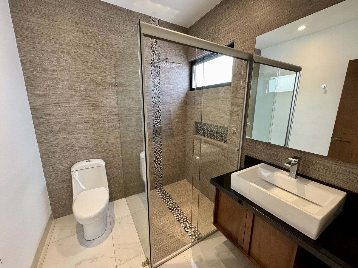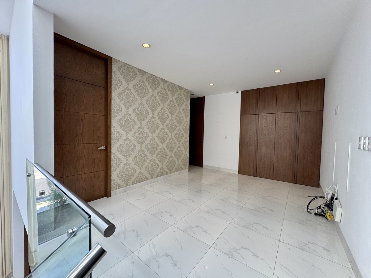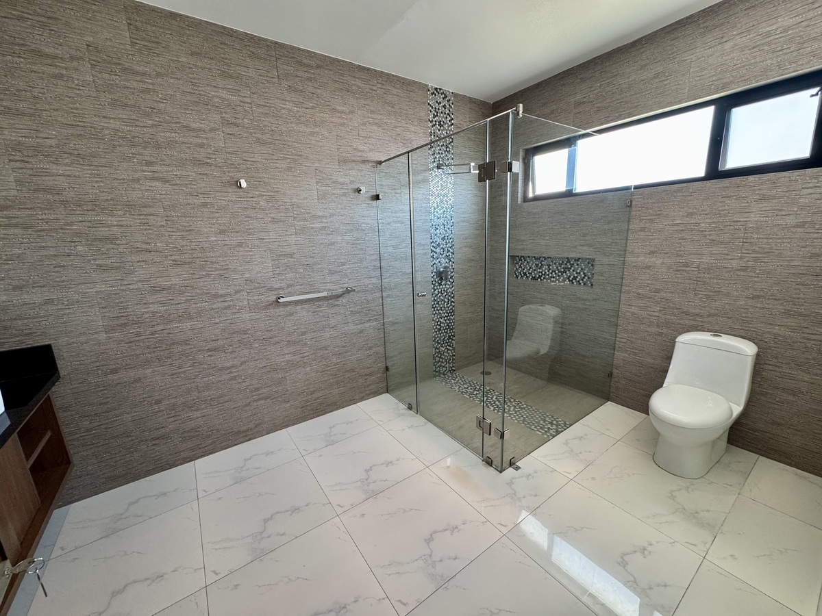 Planta alta: Habitación principal con baño y vestidor, 2 habitaciones con closet y baño compartido, sala de TV, closet de blancos