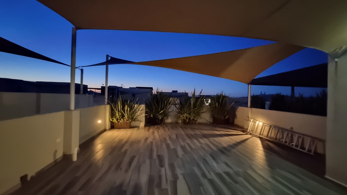 - Roof garden con velarias y vista panorámica al valle.